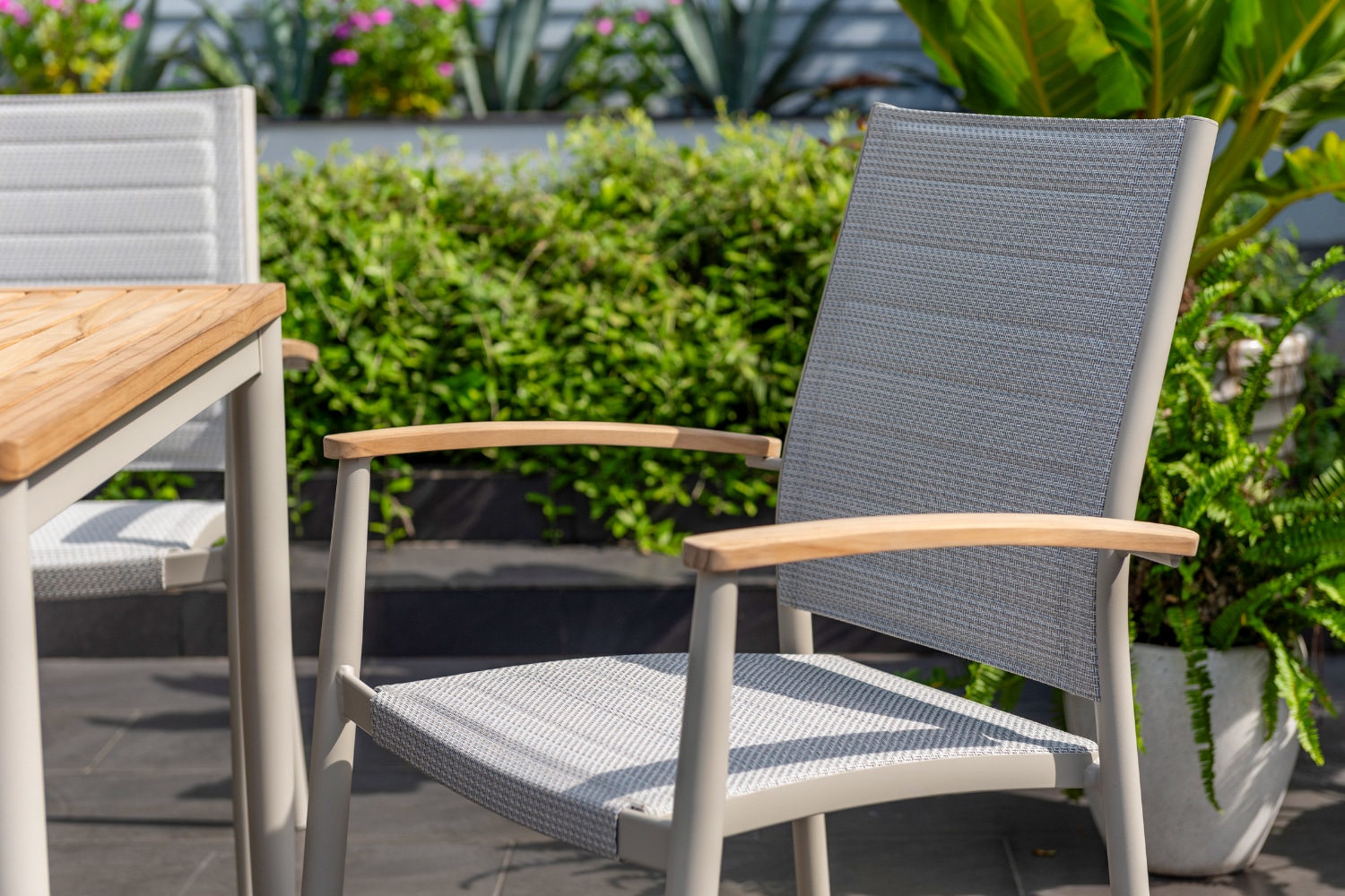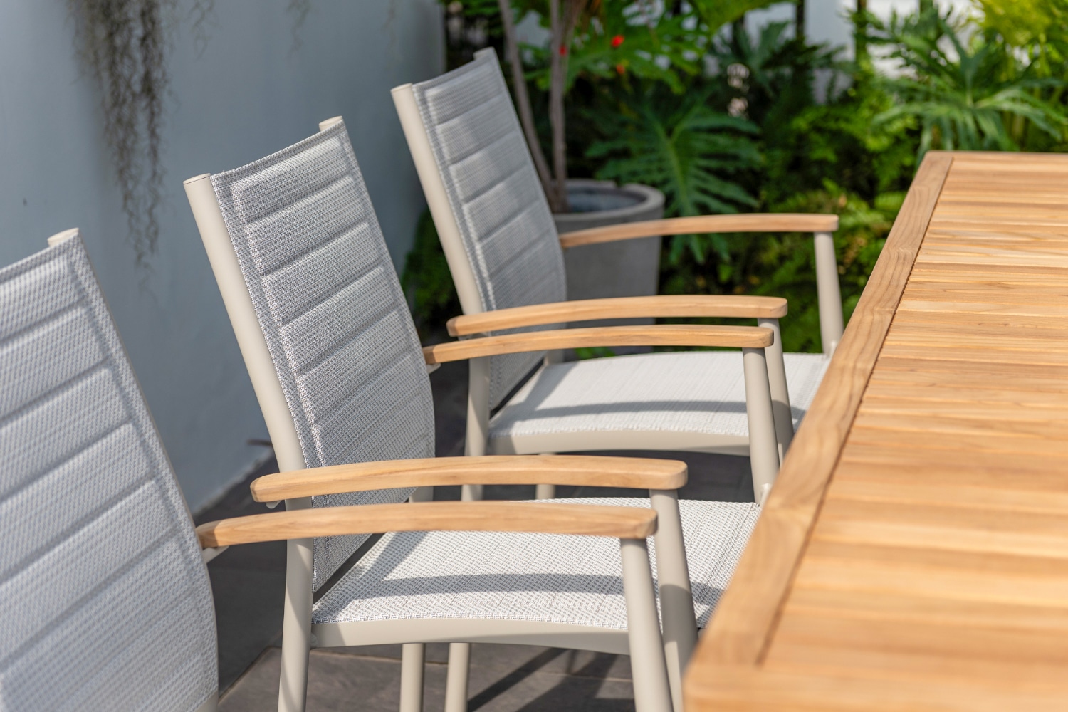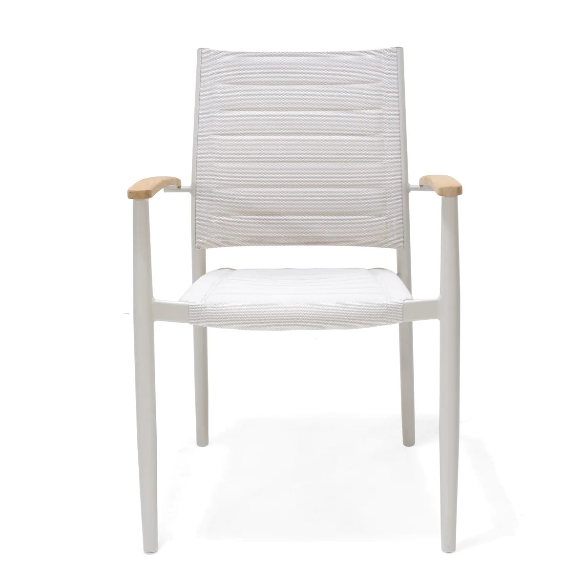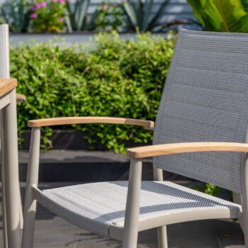 כיסא מעוצב ויוקרתי אשר בנוי משלדת אלומיניום “אל חלד” בשילוב משענות ידיים מעץ טיק אינדונזי.