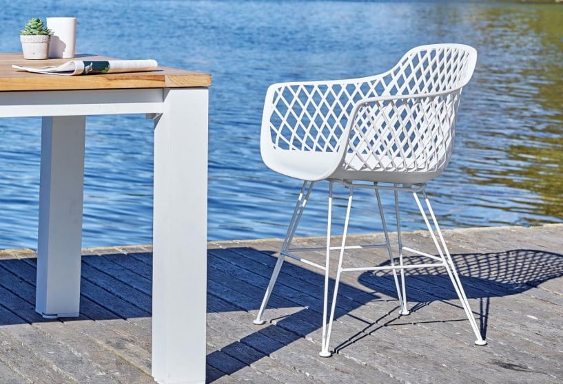 כיסא מאסיבי הבנוי מרגלי מתכת צבועה בתנור בשילוב מושב פלסטיק קשיח.