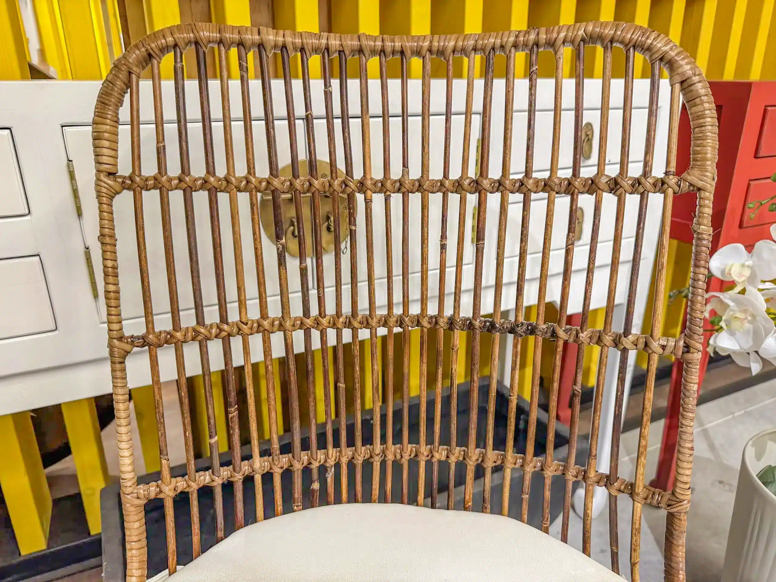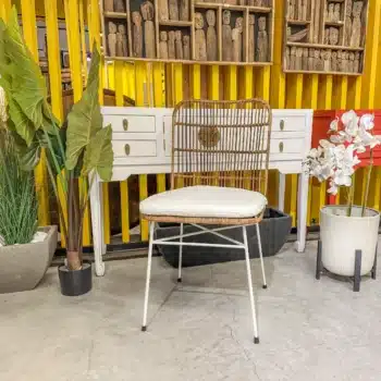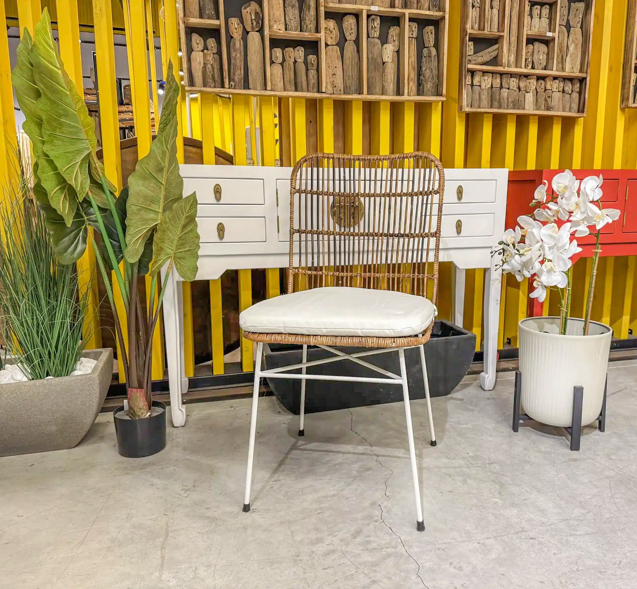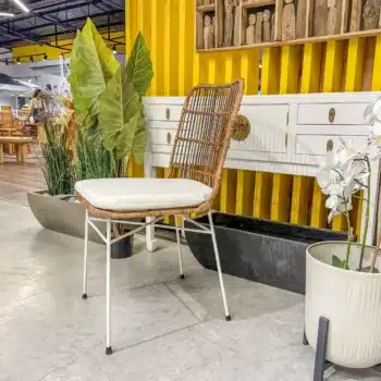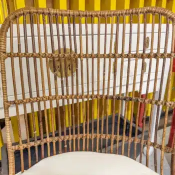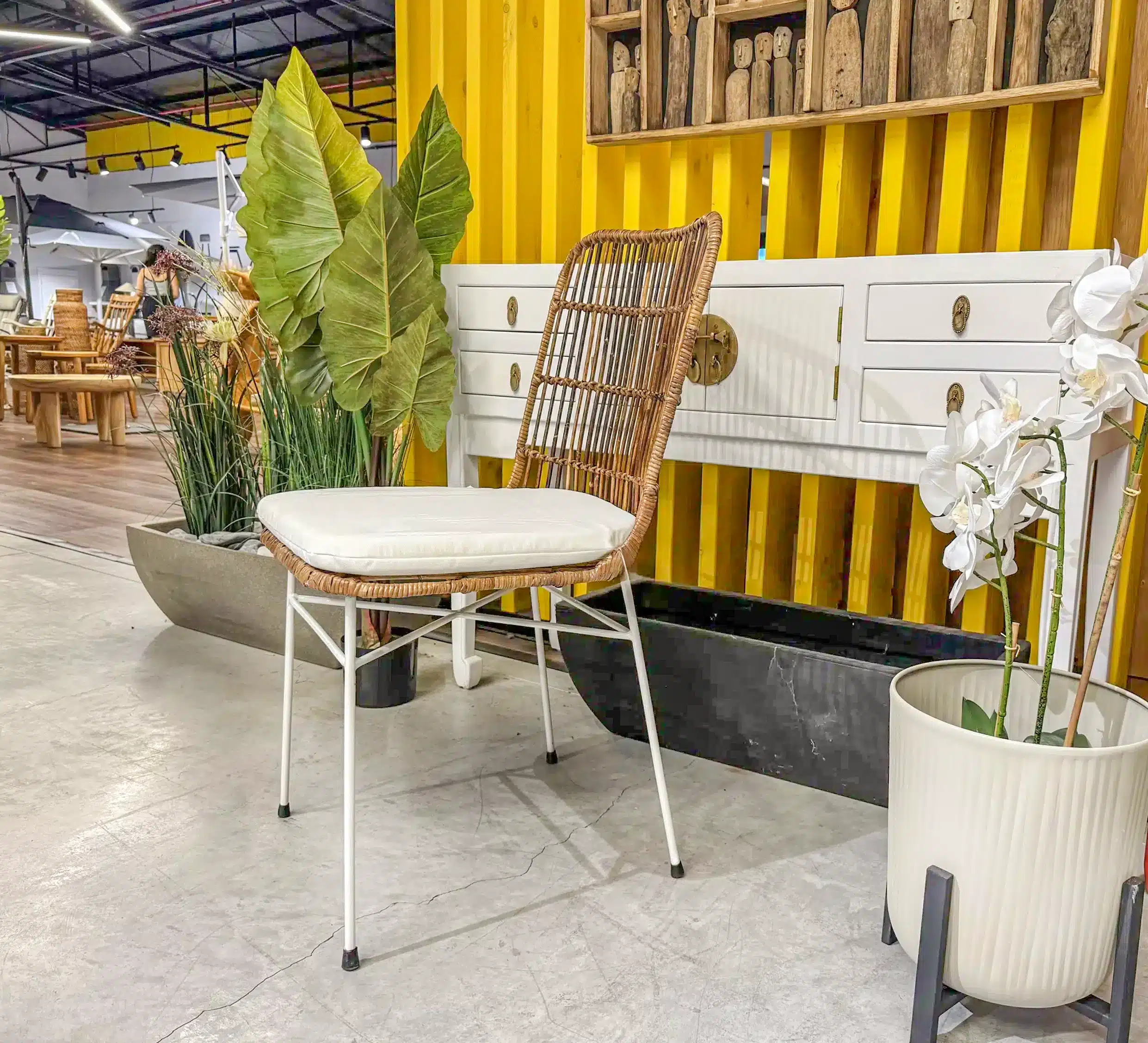 הכיסא עשוי משלדת פלדה עם שזירה של ראטן.