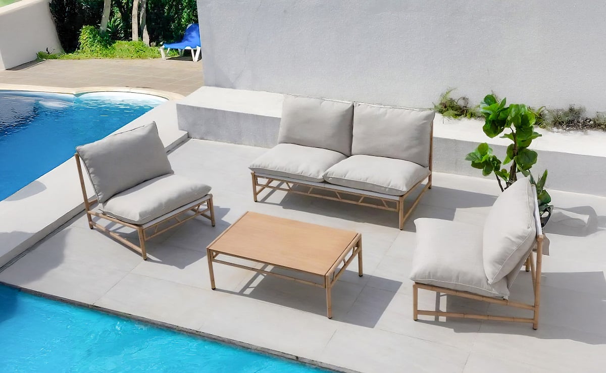 סט סלון חוץ בעיצוב טבעי ועדכני, המשלב מראה במבוק חמים עם קווים נקיים.