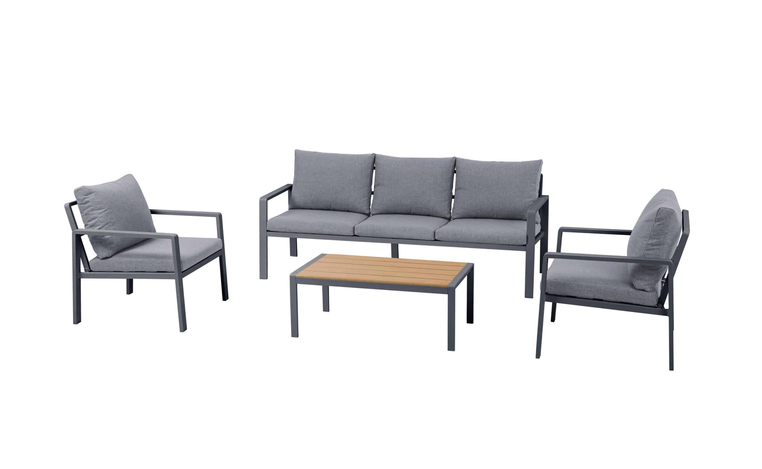 סט ישיבה מעוצב הכולל ארבעה חלקים, עם שלדת אלומיניום בצביעה בתנור בגימור מט.