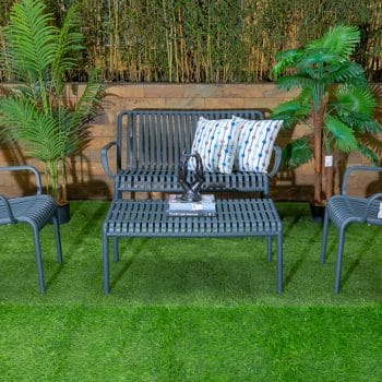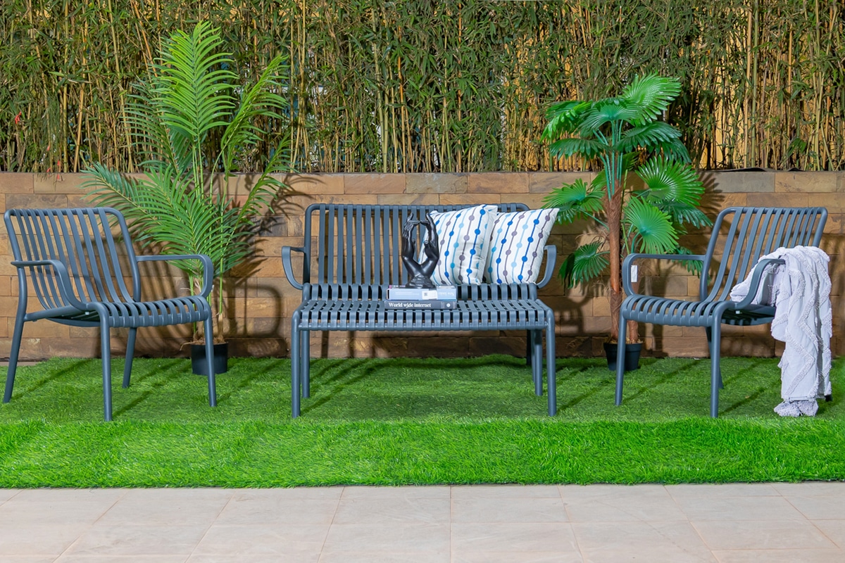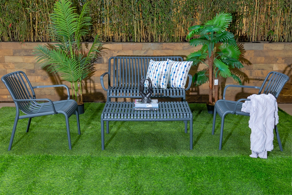 סט סלון חוץ מודרני עשוי פלסטיק מוקשח מסוג PP בשילוב ABS – חומרים קלים, חזקים ועמידים במיוחד לתנאי חוץ.