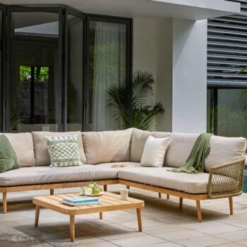 צבעים: עץ בגוון טיק, חבלים צבע זית וריפודים בצבע בז’.