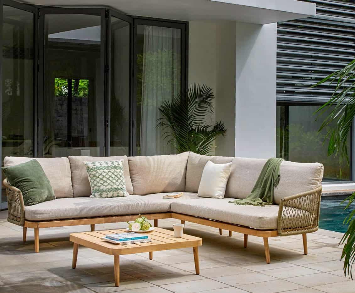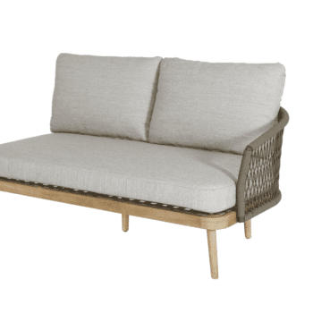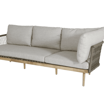 צבעים: עץ בגוון טיק, חבלים צבע זית וריפודים בצבע בז’.