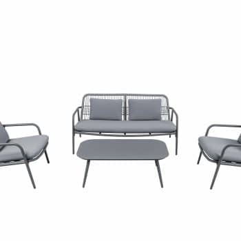 שולחן הקפה עשוי מאלומיניום עם פלטת עליונה מאלומיניום – פרקטי, קל לניקוי ומשלים את המראה האחיד של הסט.
