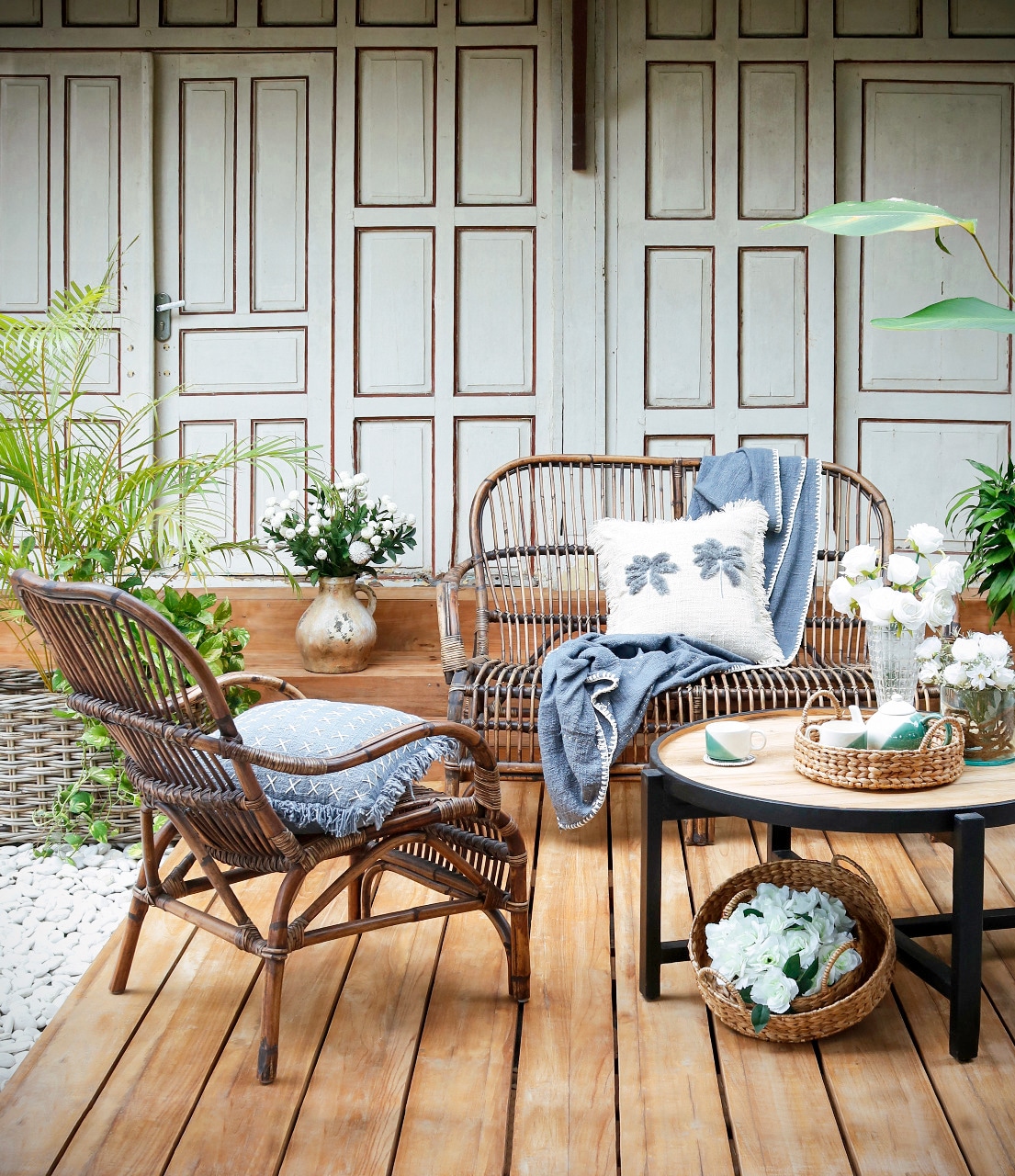 מערכת ישיבה מעוצבת הבנויה מראטן טבעי תוצרת אינדונזיה.