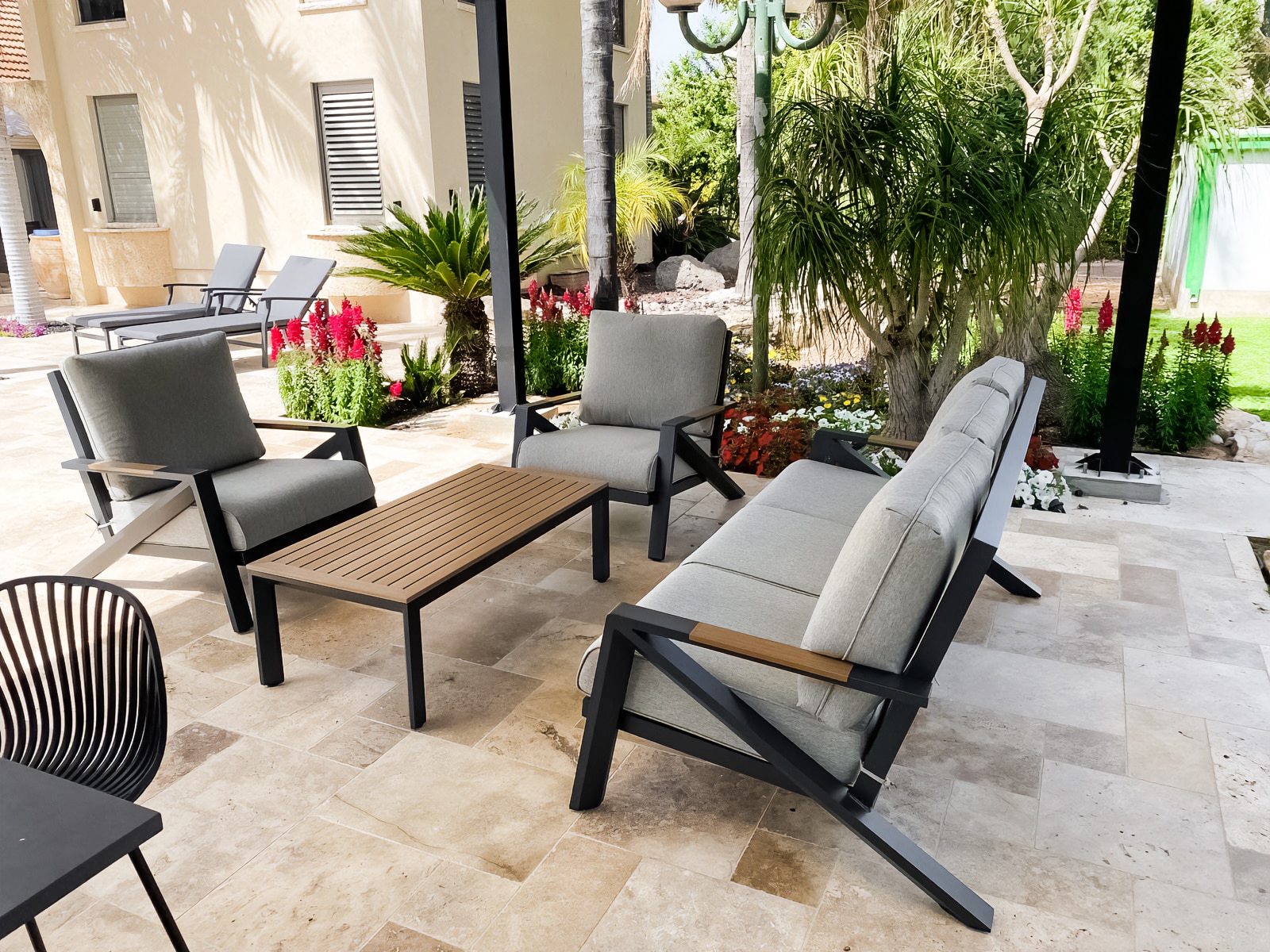 מערכת ישיבה מאסיבית מאלומיניום “אל חלד” לגינה או למרפסת בשילוב PVC דמוי עץ.