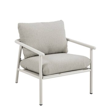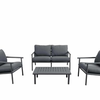 סט ישיבה חוץ במראה טבעי ומעודן, כולל ספה זוגית, שתי כורסאות ושולחן קפה.