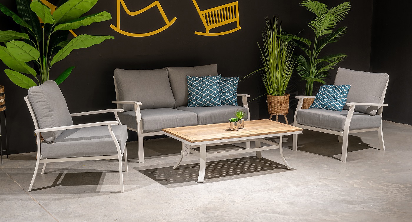 הסט בנוי מאלומיניום “אל חלד” בשילוב משטח עץ עליון לשולחן.