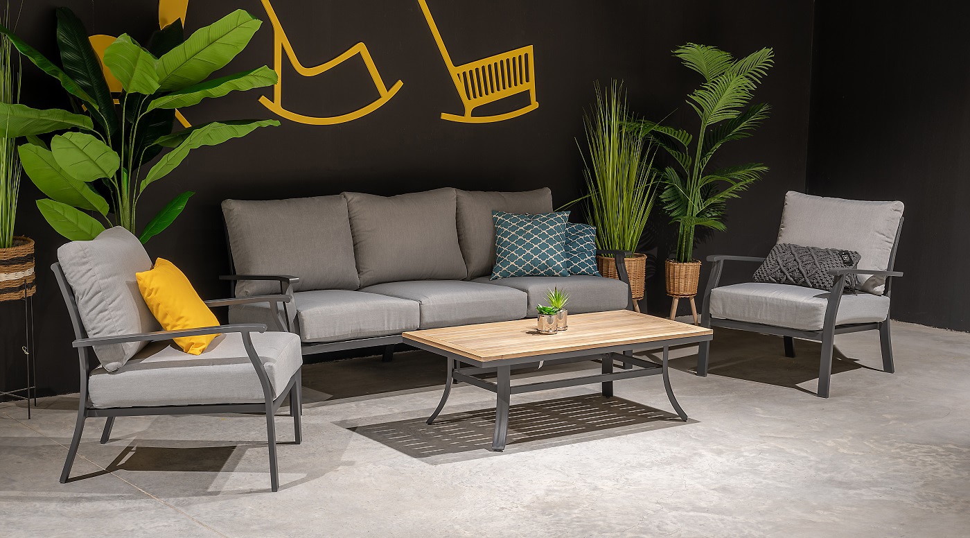הסט בנוי מאלומיניום “אל חלד” בשילוב משטח עץ עליון לשולחן.