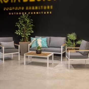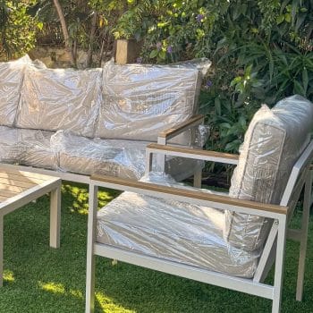 מערכת ישיבה מאלומיניום “אל חלד” הכולל ספה זוגית, 2 ספות יחיד ושולחן. ריפודים רחיצים.