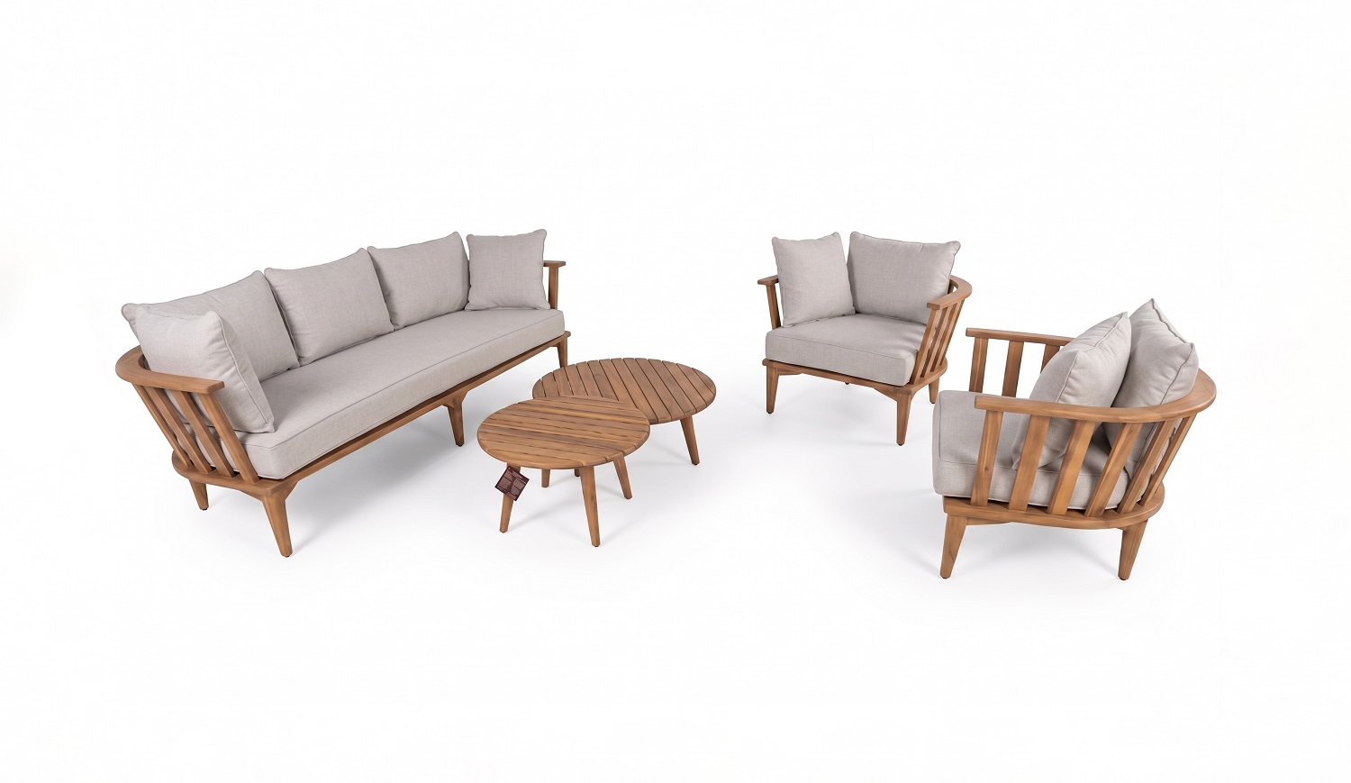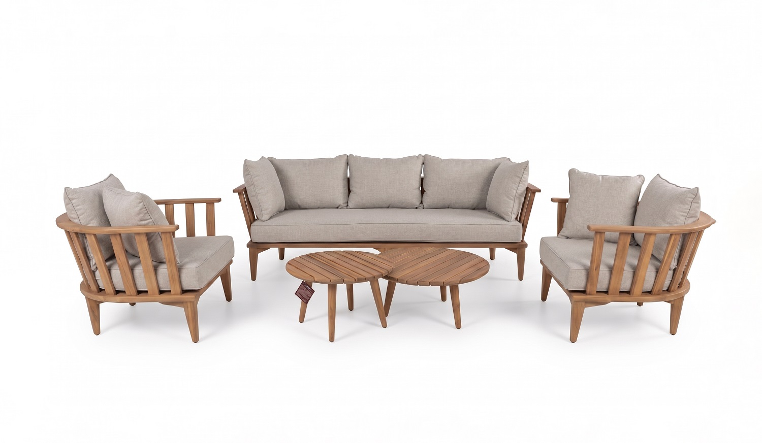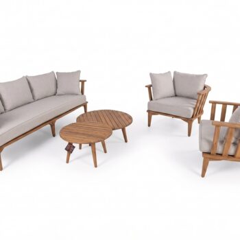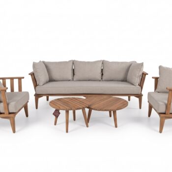 המערכת מורכבת מספה תלת בשילוב זוג כורסאות יחיד וזוג שולחנות עגולים.
