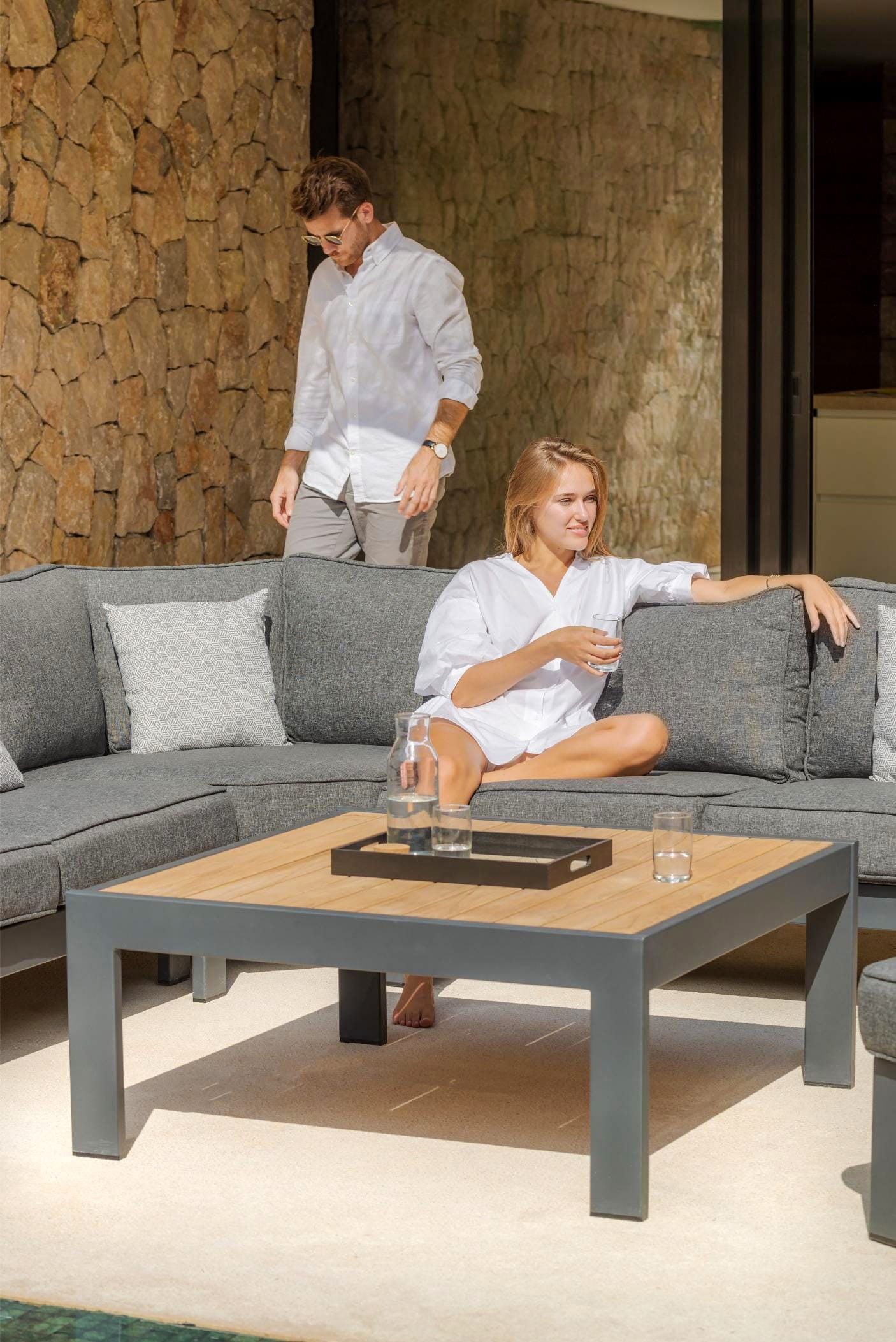 שולחן אלומיניום בשילוב לוחות עץ טיק.