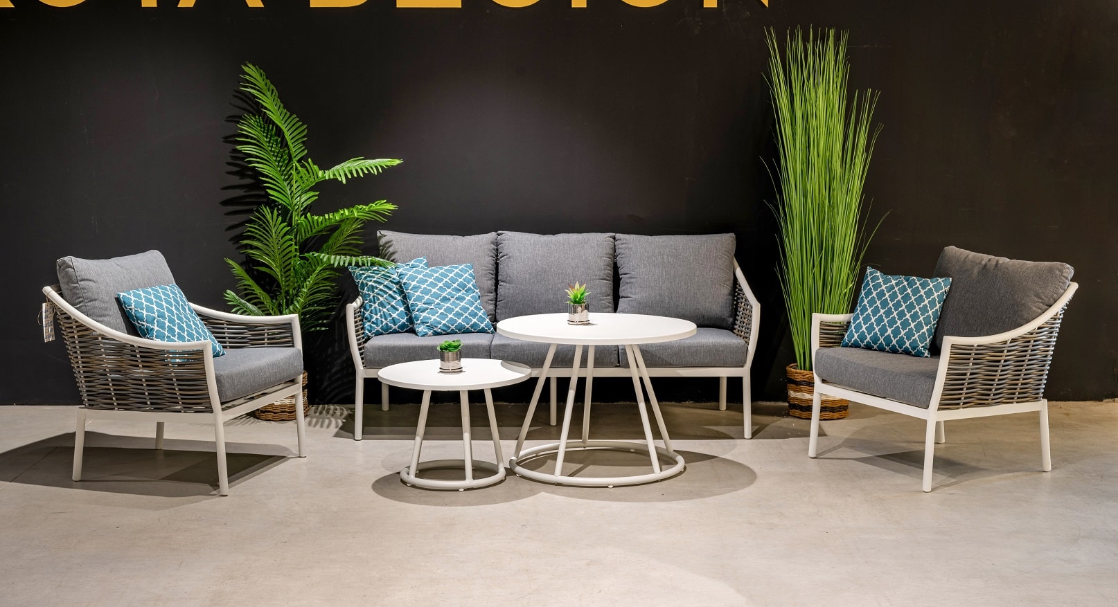 הסט כולל ספת תלת, 2 ספות יחיד וזוג שולחנות.