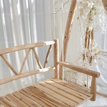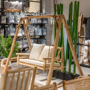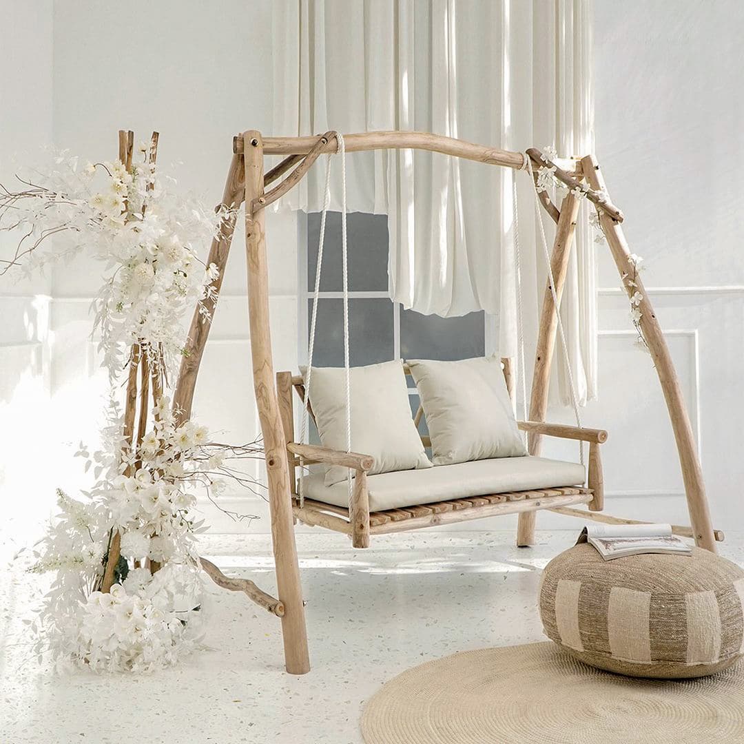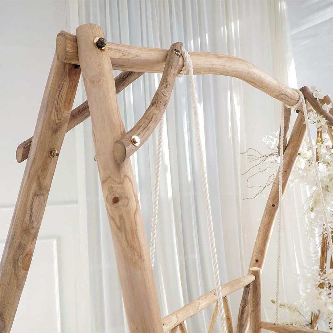 נדנדה הבנויה מענפי עץ טיק אינדונזי בשילוב ריפוד חוץ.