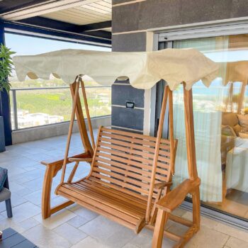 הנדנדה כוללת גג עץ מלא + גגון בד.