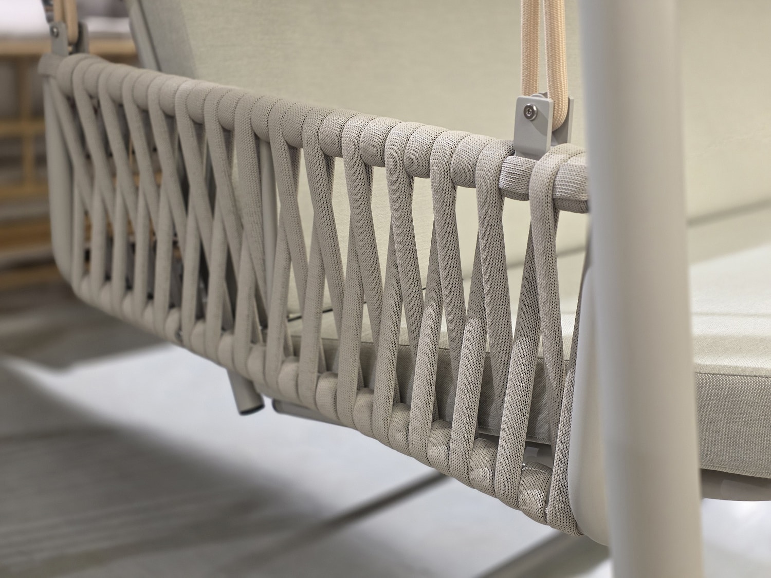 צבע: מסגרת אפור חול, חבלים קרם אפרפר, ריפוד קרם אפרפר.