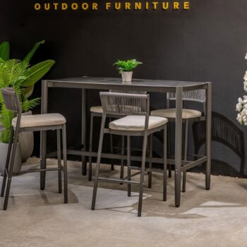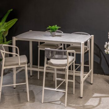 המערכת כוללת שולחן + 4 כיסאות בר עם משענות ידיים.