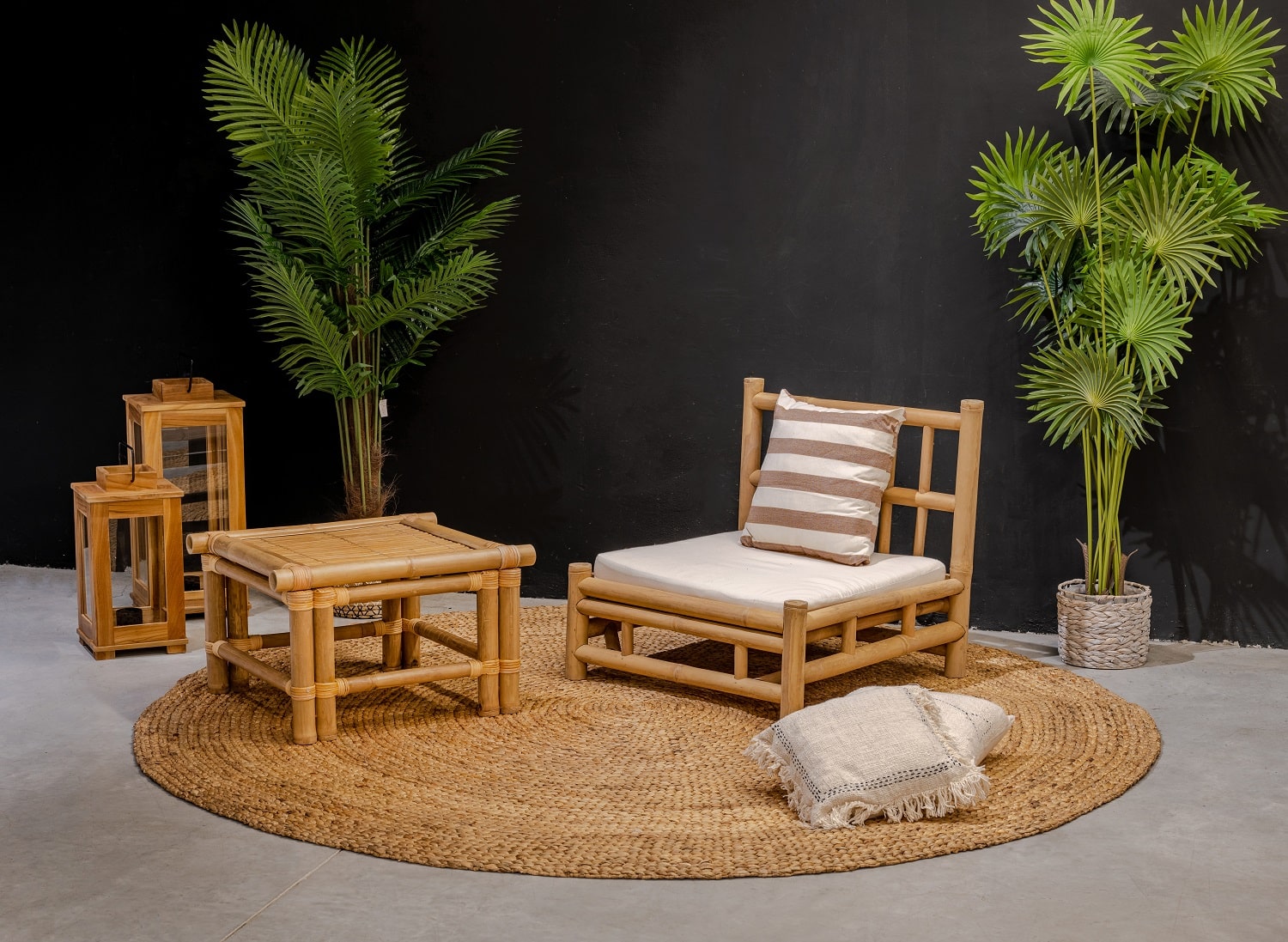 הסט בנוי מבמבוק מאסיבי הכולל ריפוד ישיבה חוץ רחיץ.