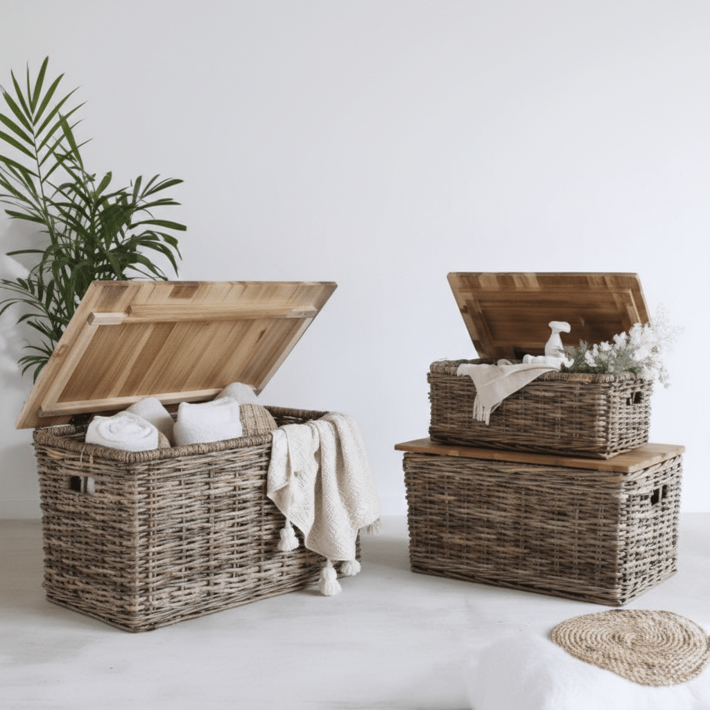 הארגזים עשויים מראטן טבעי המאופיין בצבע אפור-חום ייחודי וטבעי. צבע זה מתקבל בתהליך טבעי ללא צביעה מלאכותית, מה שמעניק למוצרים מראה כפרי, מודרני וטבעי, ועמידות גבוהה לאורך זמן.