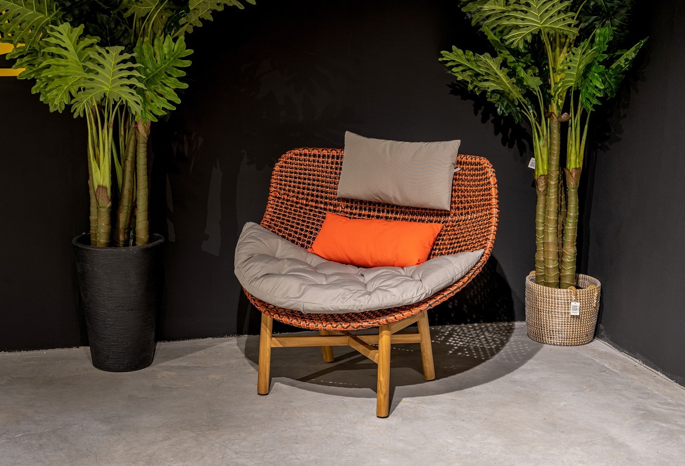 הכורסא בנויה משלדת עץ טיק, בשילוב גוף אלומיניום “אל חלד” בחיפוי ראטן סינטטי.
