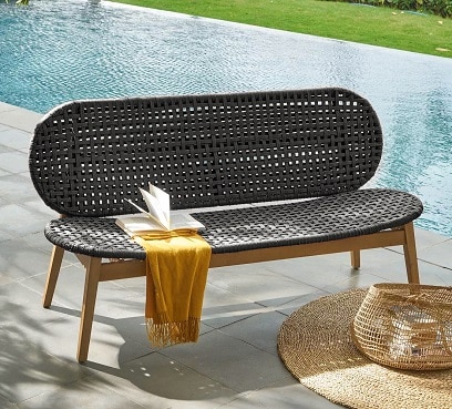 ספסל מעוצב מעץ שיטה בגימור עץ טיק ובשילוב חבלים סינטטיים.