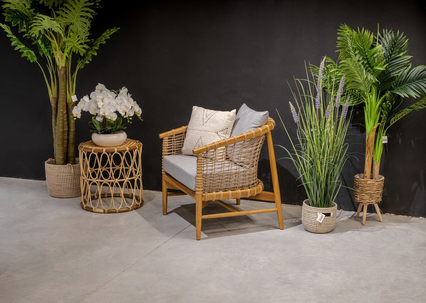 הספה בנויה מעץ טיק אינדונזי בשילוב חבלי נאוטיקה דמוי טבעי.