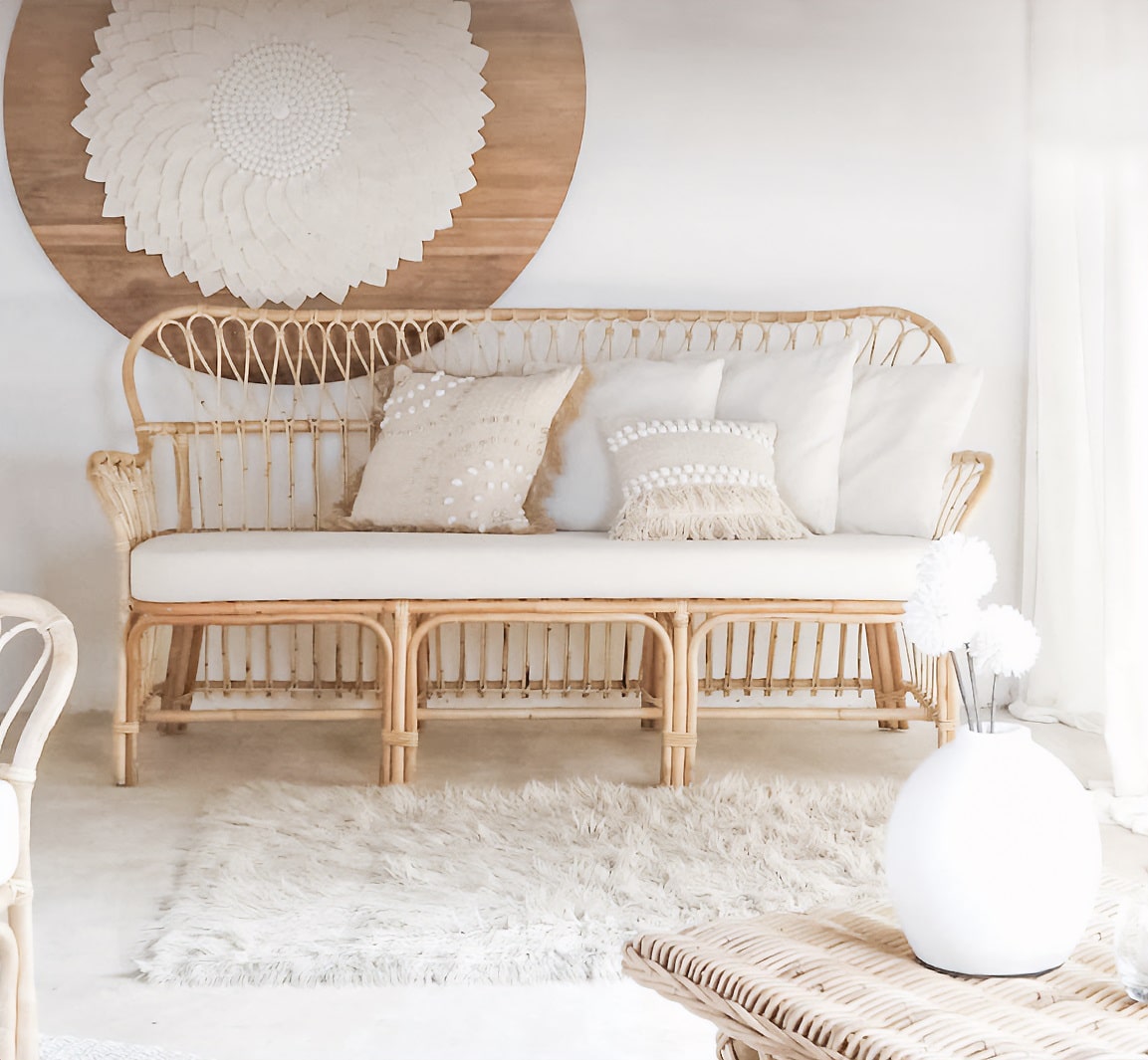 ספת תלת מעוצבת הבנויה מראטן טבעי תוצרת אינדונזיה.