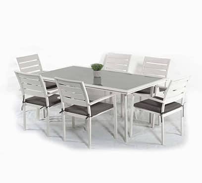 שולחן אלומיניום מחוזק דגם ברצלונה במידה 180X100 ס”מ בשילוב 6 כיסאות מדגם אוליבר.