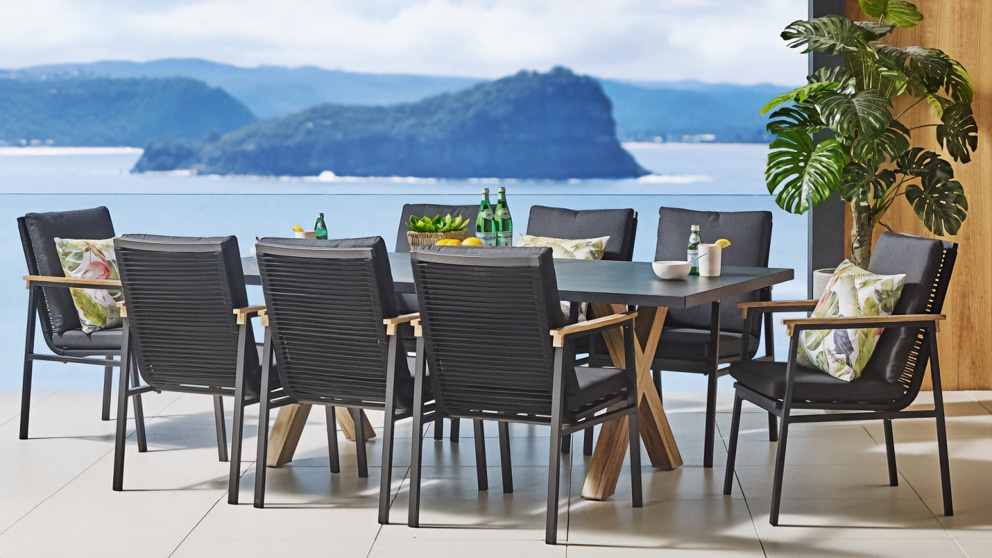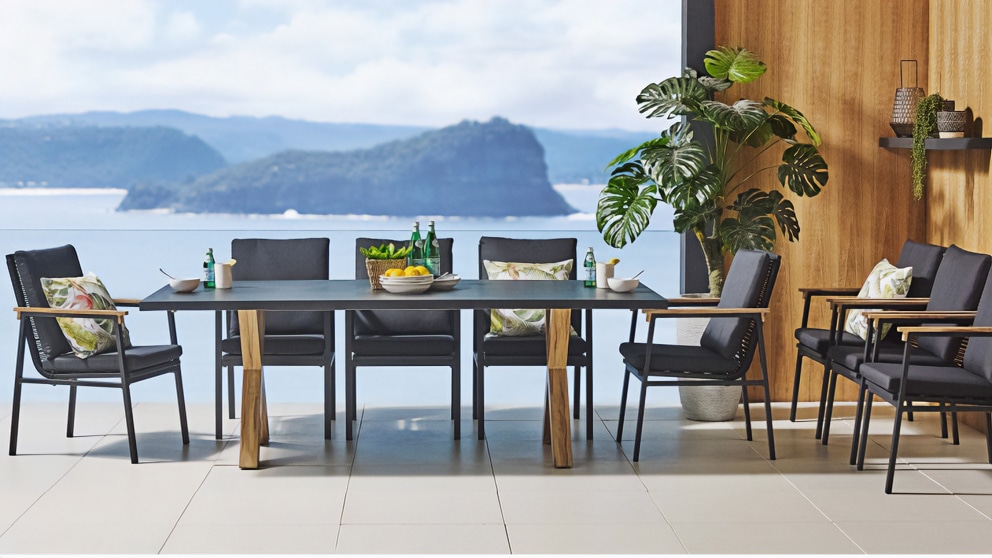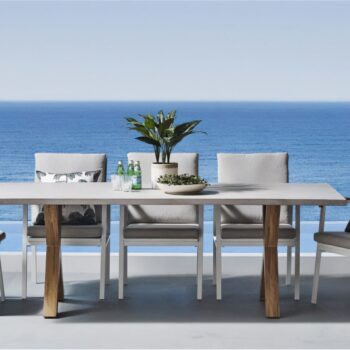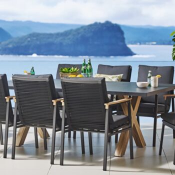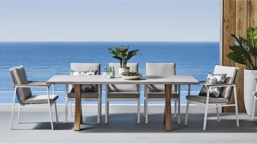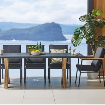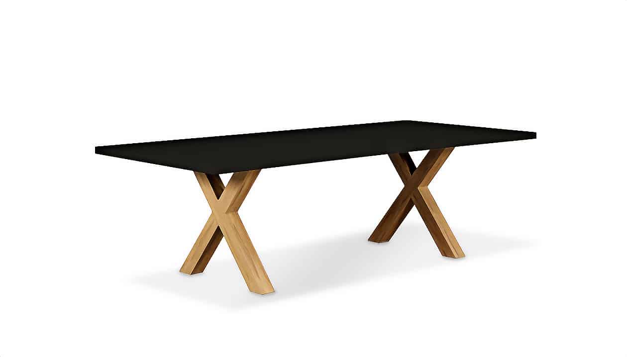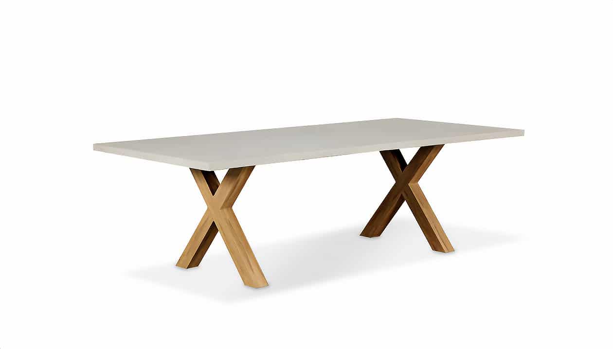 שולחן יוקרתי במיוחד הבנוי מרגלי אלומיניום “דמוי עץ” בשילוב פלטת בטון מחוזק פיברגלס.