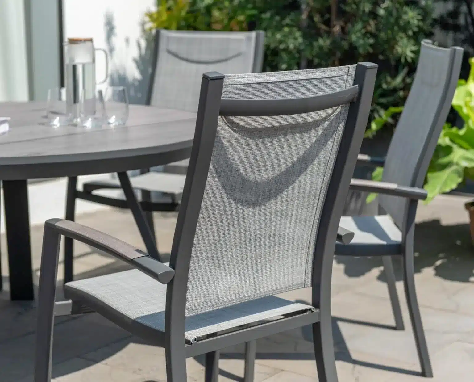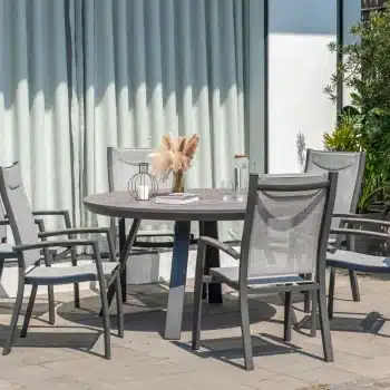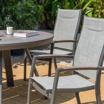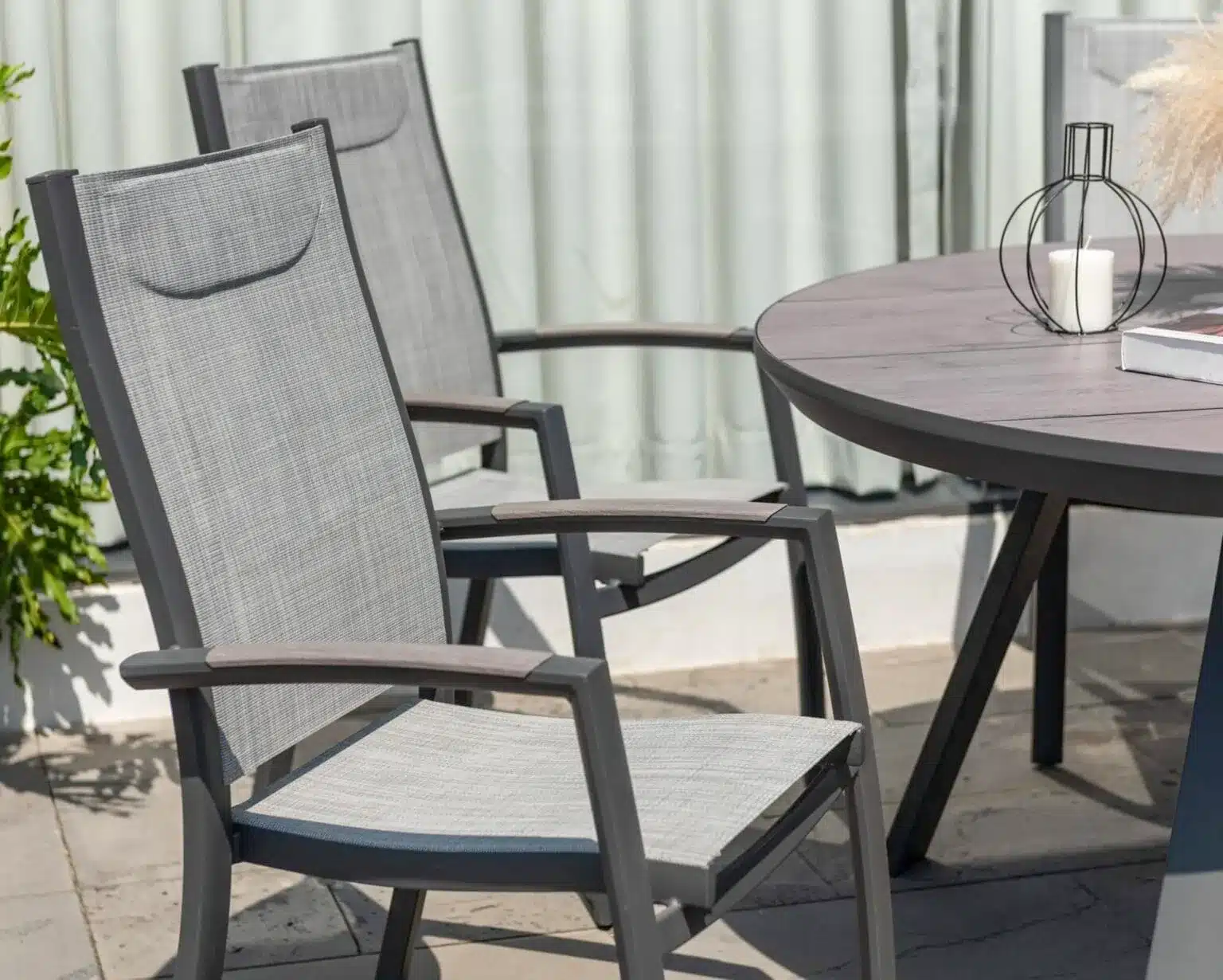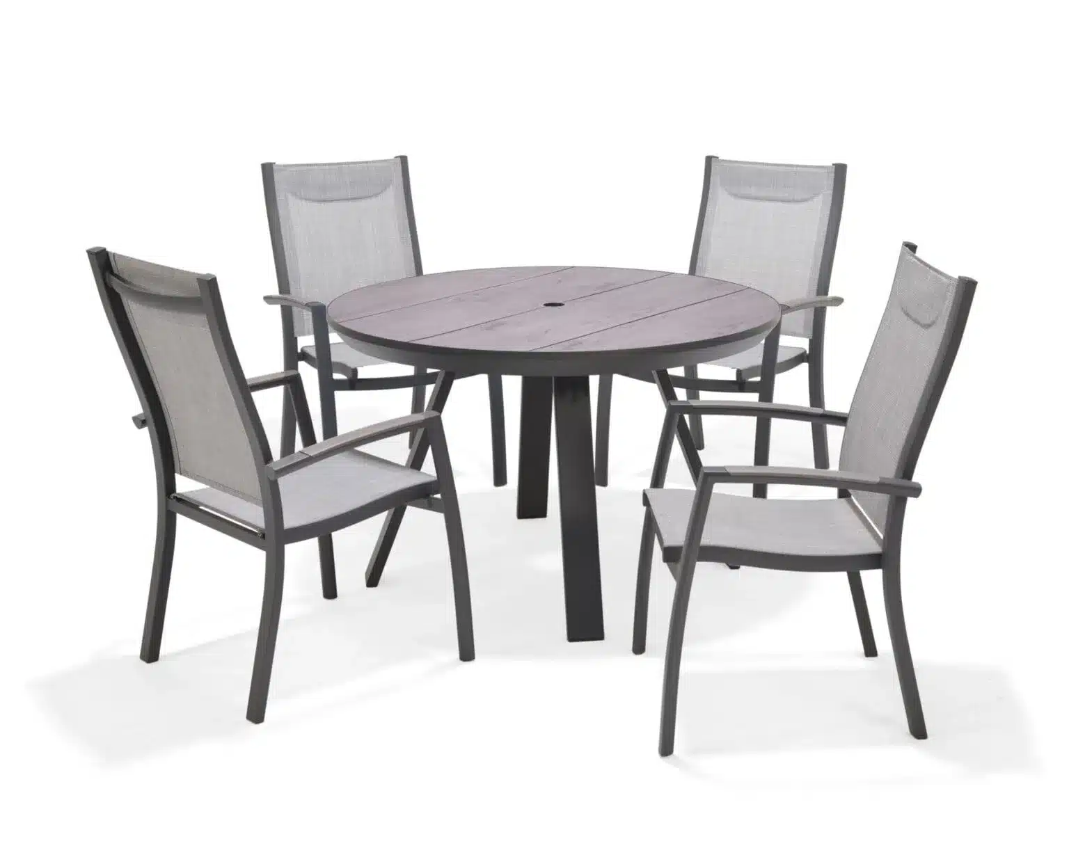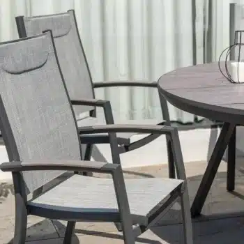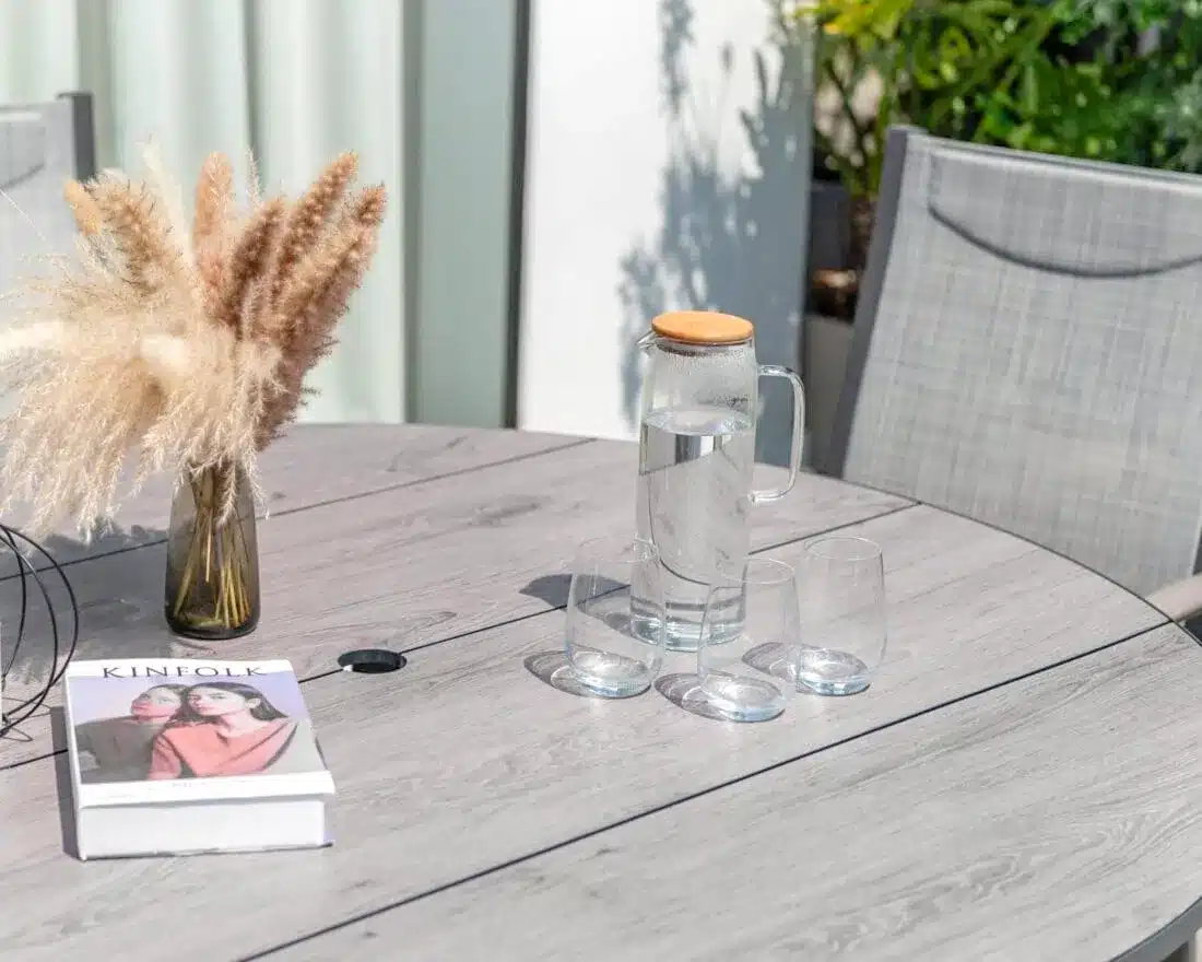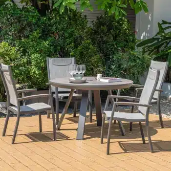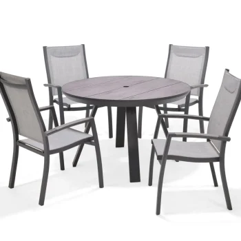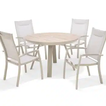 הפינה כוללת שולחן עגול בקוטר 119 ס”מ עם משטח DuraBoard: חומר מרוכב מתקדם המדמה עץ טבעי, עמיד במיוחד בפני מזג אוויר, שריטות ולכלוך, ואינו דורש תחזוקה.