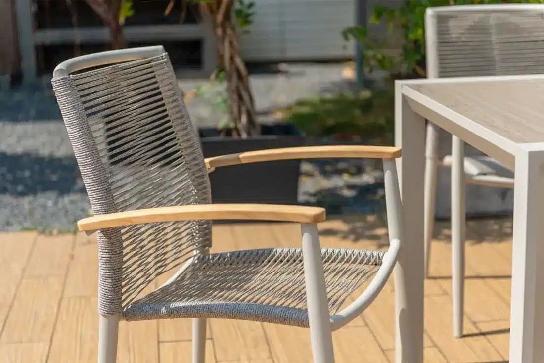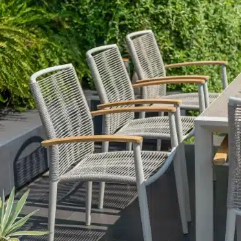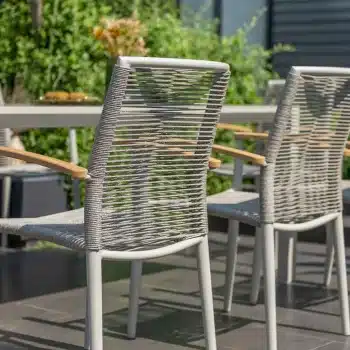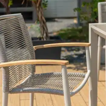 שזירת החבלים מעניקה לכיסא מראה ייחודי ומעודכן, והגב המשופע מעוצב לנוחות אופטימלית גם בישיבה ממושכת.