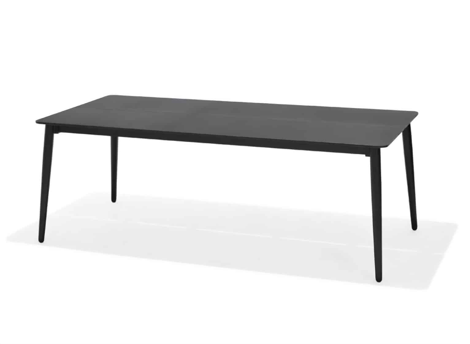 השולחן בנוי משלדת אלומיניום “אל חלד” בשילוב לוחות דמוי עץ שחור.