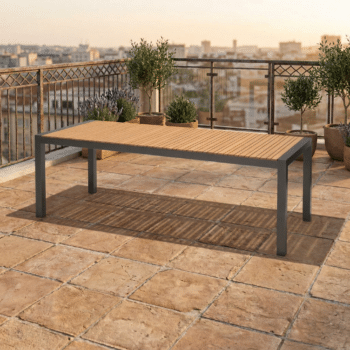 השולחן עשוי שלדת אלומיניום “אל חלד” בשילוב לוחות עץ אקליפטוס FSC.