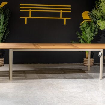 השולחן בנוי משלדת אלומיניום “אל חלד” בשילוב לוחות עץ אקליפטוס FSC.