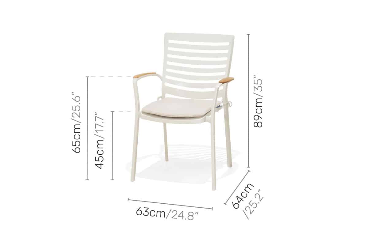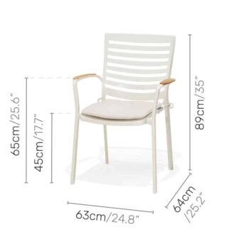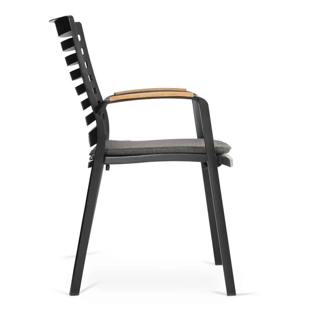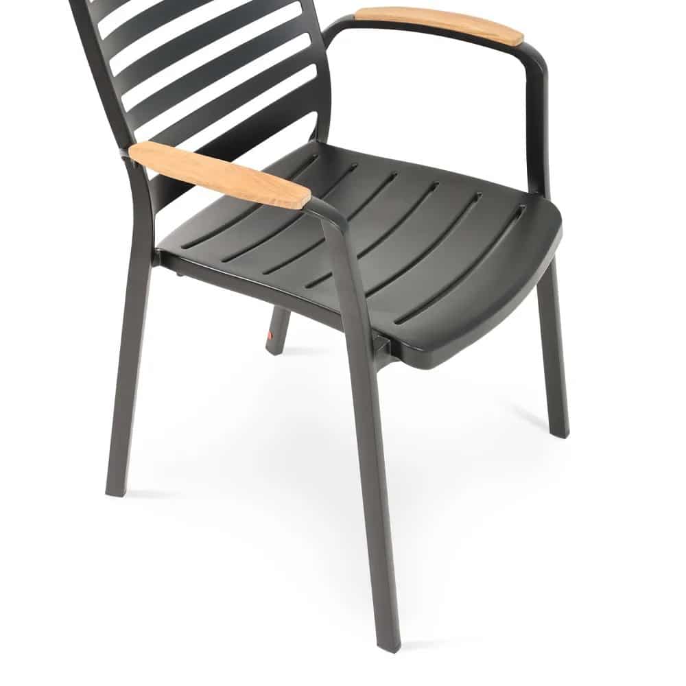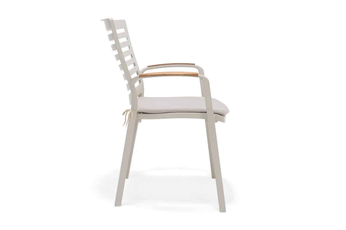 כיסא מעוצב ויוקרתי אשר בנוי משלדת אלומיניום “אל חלד” בשילוב משענות ידיים מעץ טיק אינדונזי.