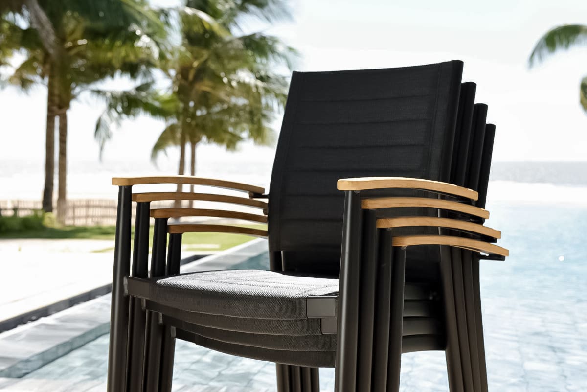 כיסא מעוצב ויוקרתי אשר בנוי משלדת אלומיניום “אל חלד” בשילוב משענות ידיים מעץ טיק אינדונזי.