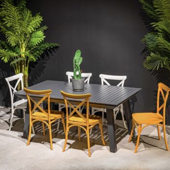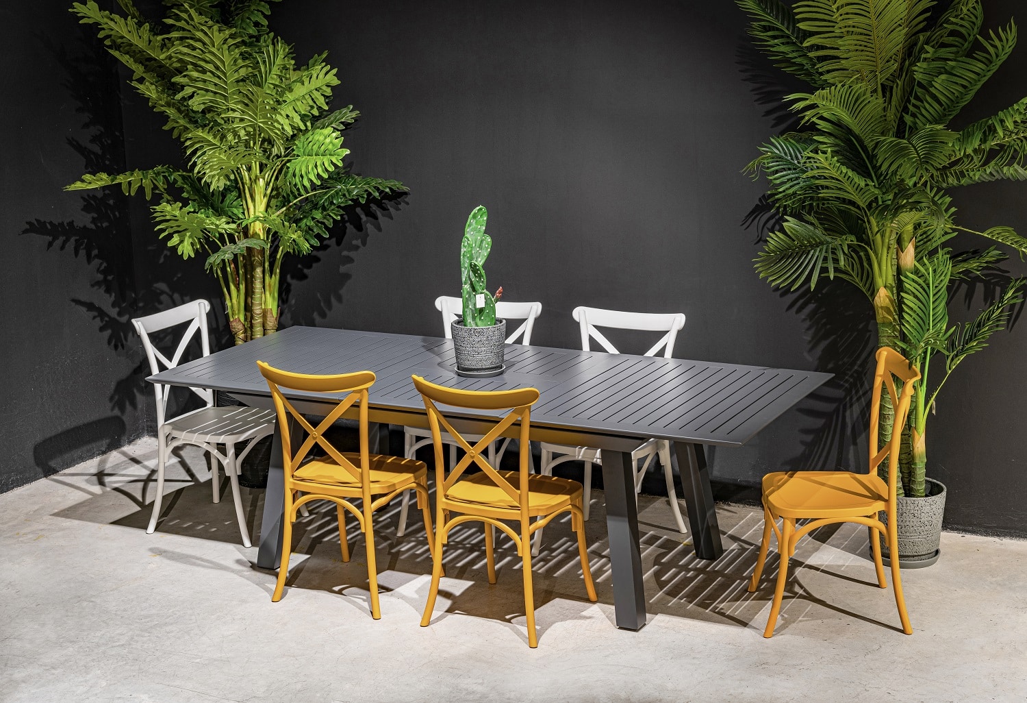 שולחן נפתח העשוי אלומיניום “אל חלד” במידה 175*100 ס”מ, נפתח ל-240 ס”מ.