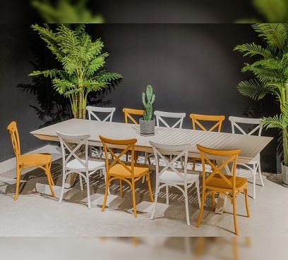 שולחן נפתח העשוי אלומיניום “אל חלד” במידה 214*100 ס”מ, נפתח ל-300 ס”מ.
