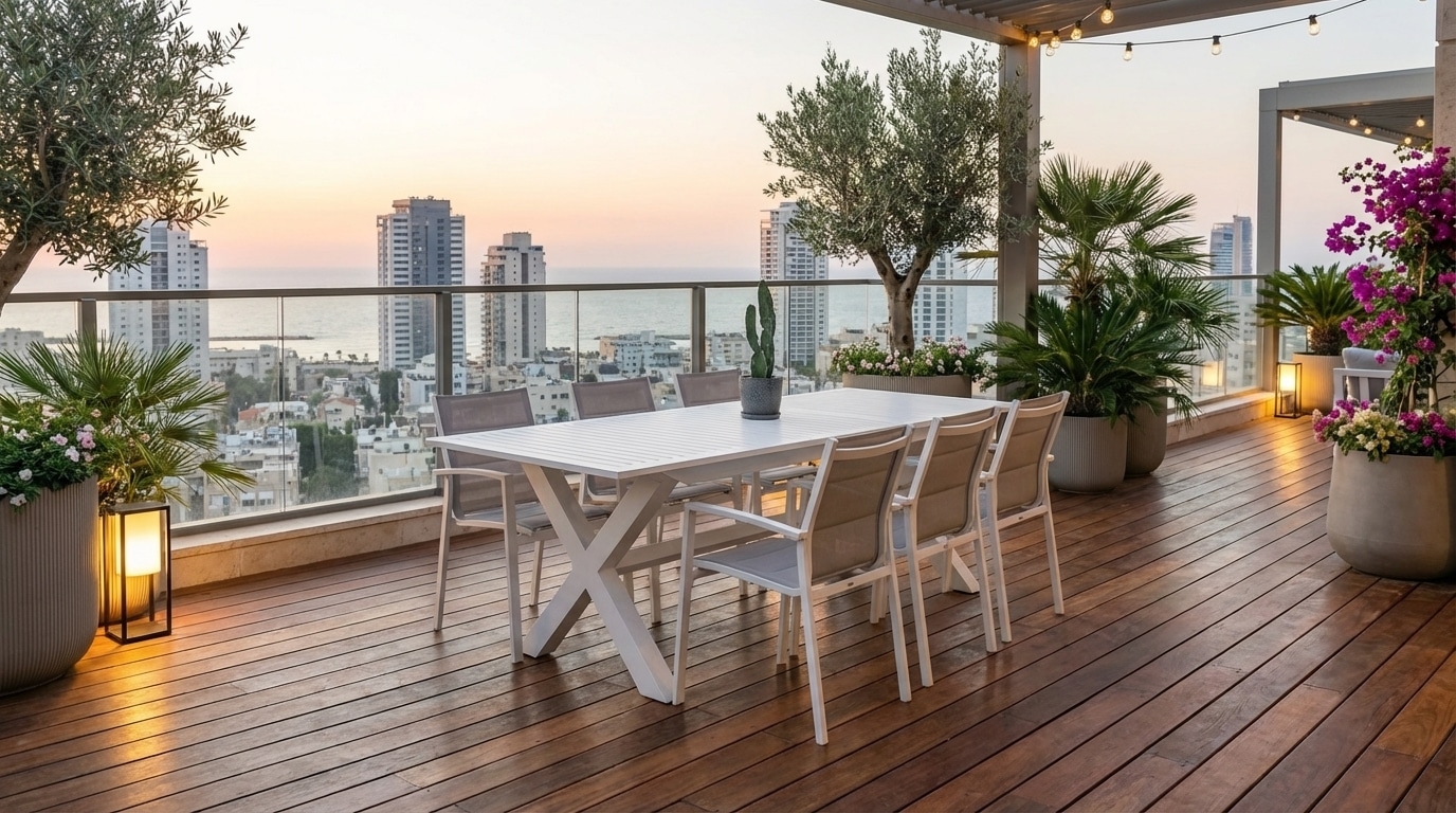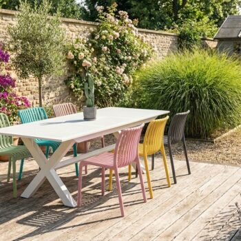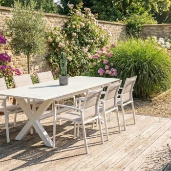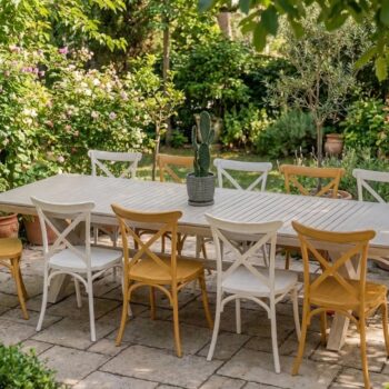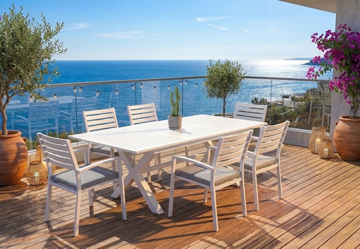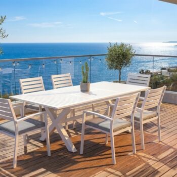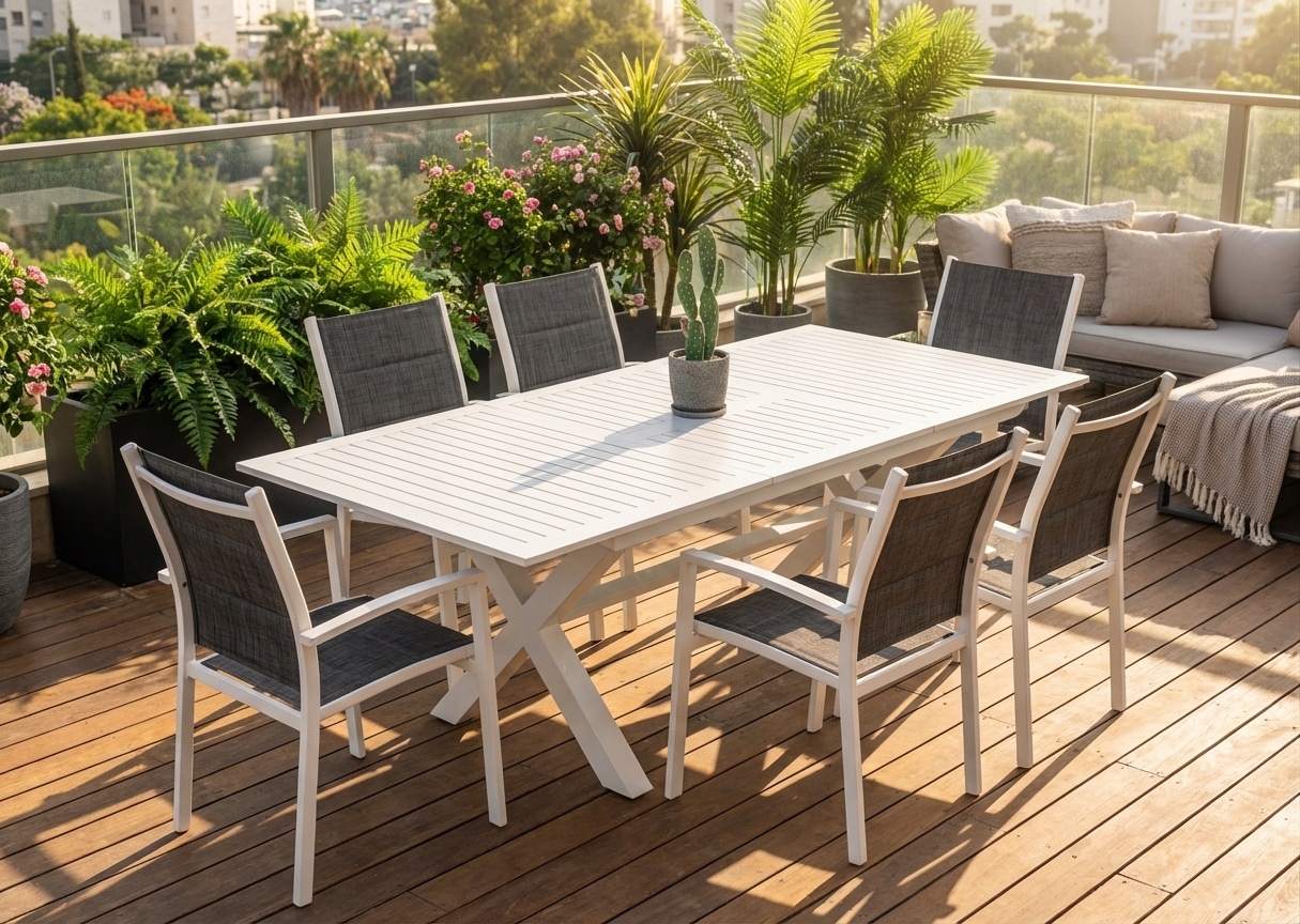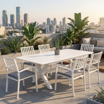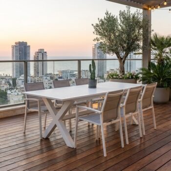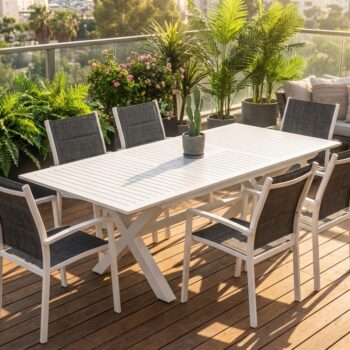 שולחן נפתח העשוי אלומיניום “אל חלד” במידה 214*100 ס”מ, נפתח ל-300 ס”מ.