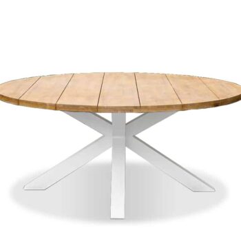 שולחן אלומיניום “אל חלד” בשילוב משטח עץ שיטה מלא עליון בקוטר 178 ס”מ.