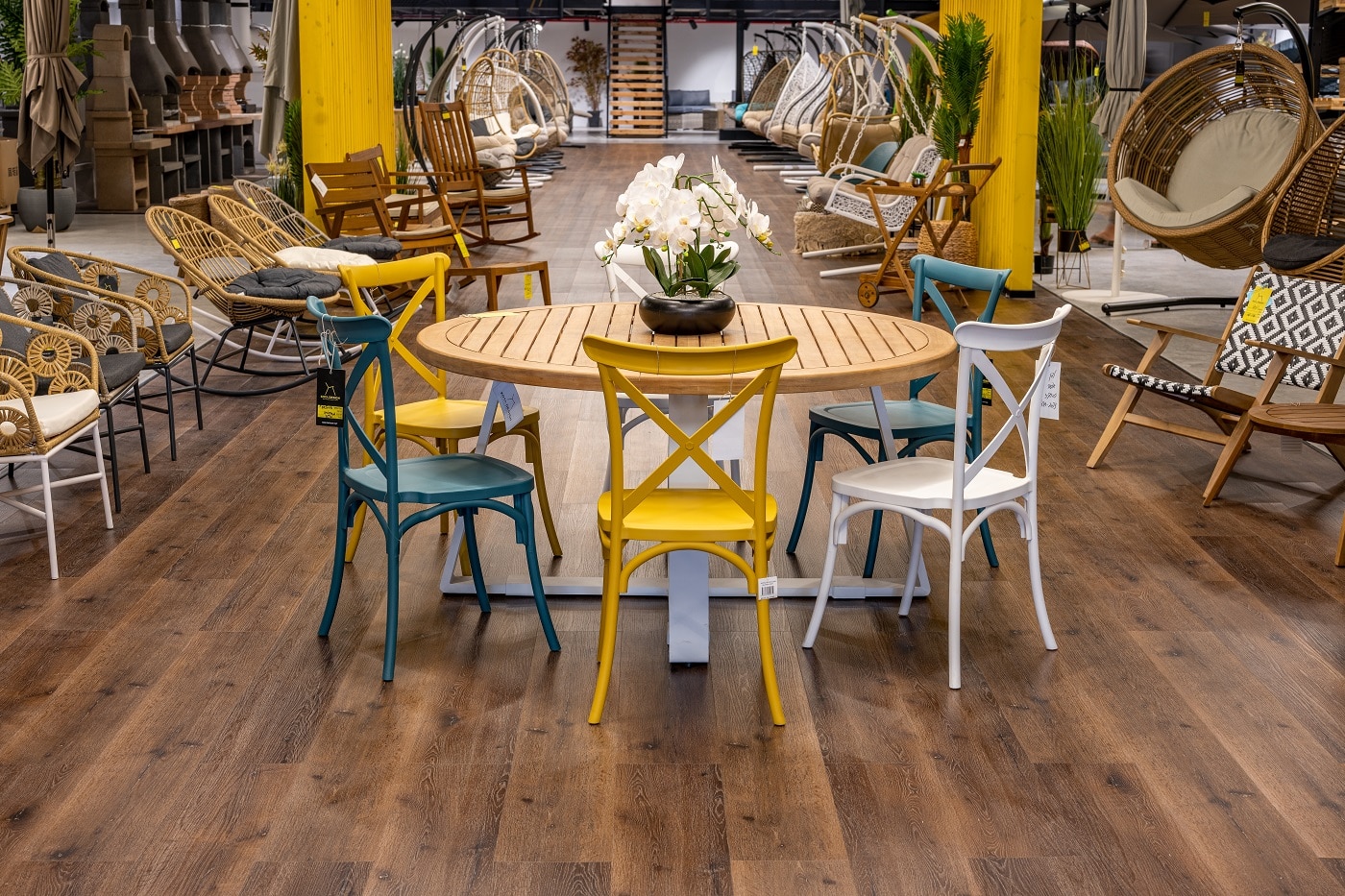 צבעי הכיסאות: לבן, צהוב, טורקיז, אפור.