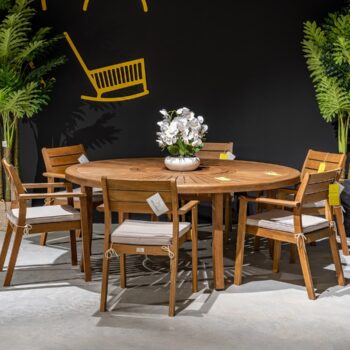 שולחן סאן 180 ס”מ קוטר, בשילוב 6 כיסאות יורק. כולל ריפודים.
