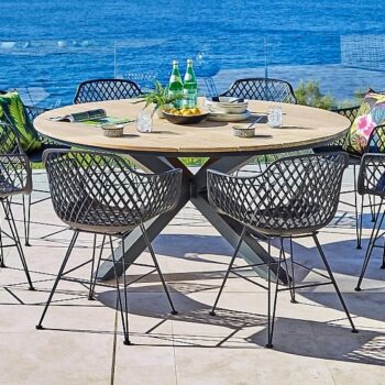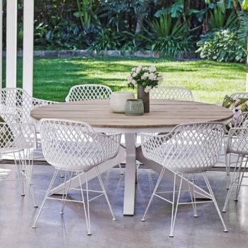 פינת אוכל מעוצבת מאלומיניום “אל חלד” בשילוב משטח עץ שיטה מלא.