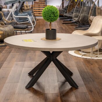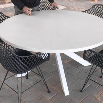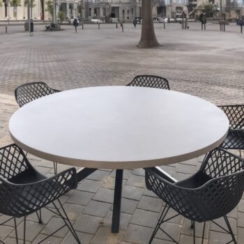 השולחן בנוי משלדת אלומיניום “אל חלד” בשילוב משטח בטון עליון דמוי גרניט.
