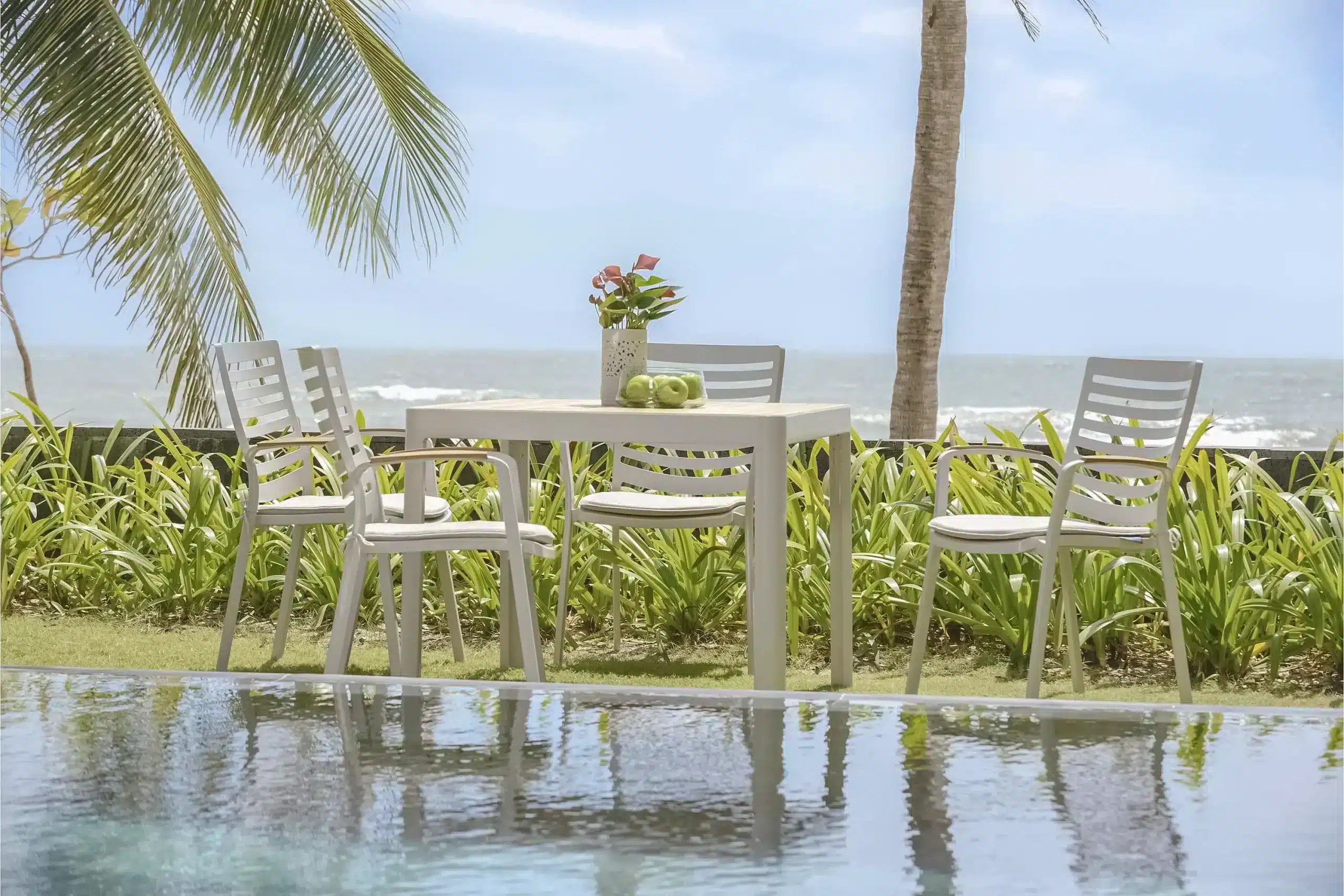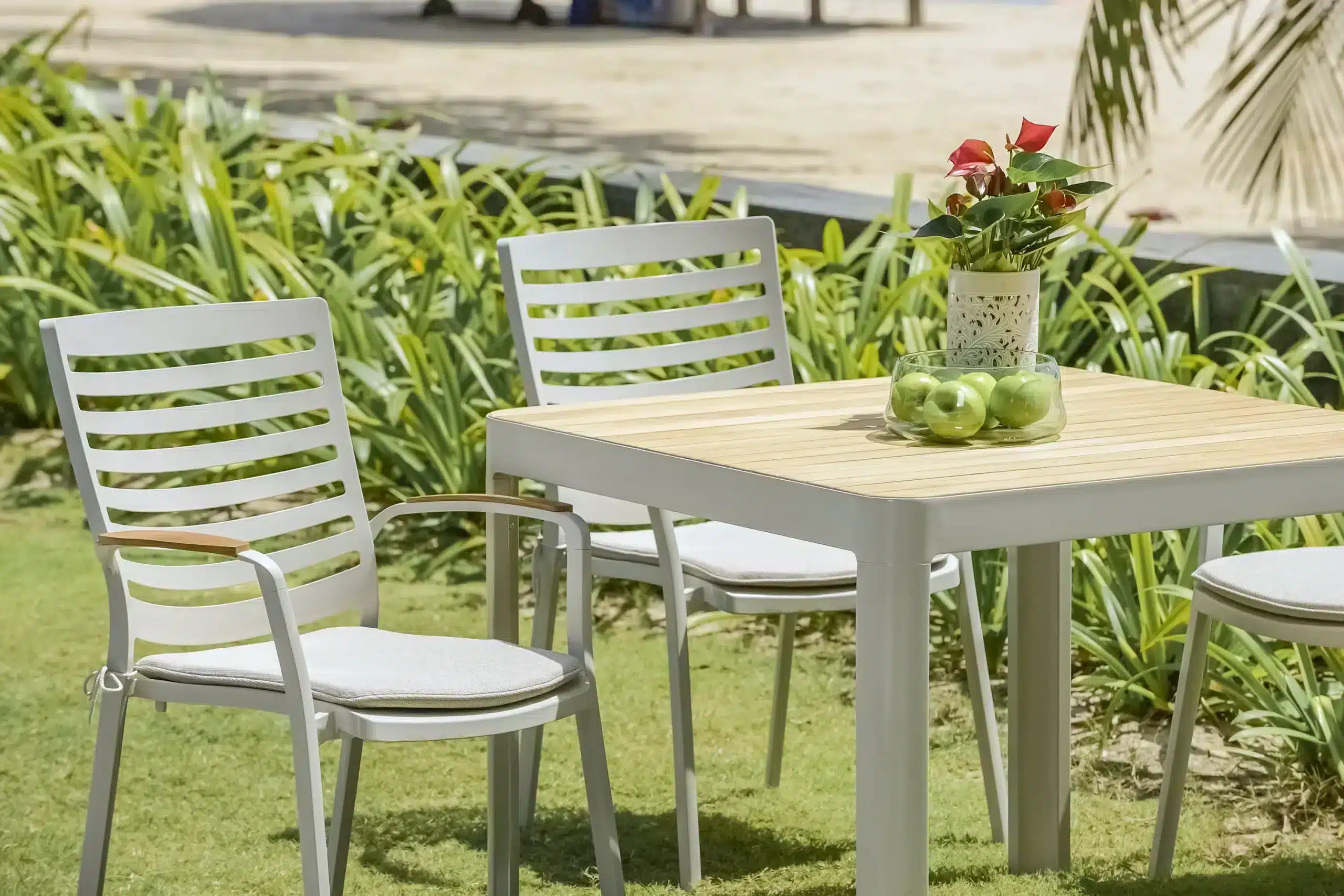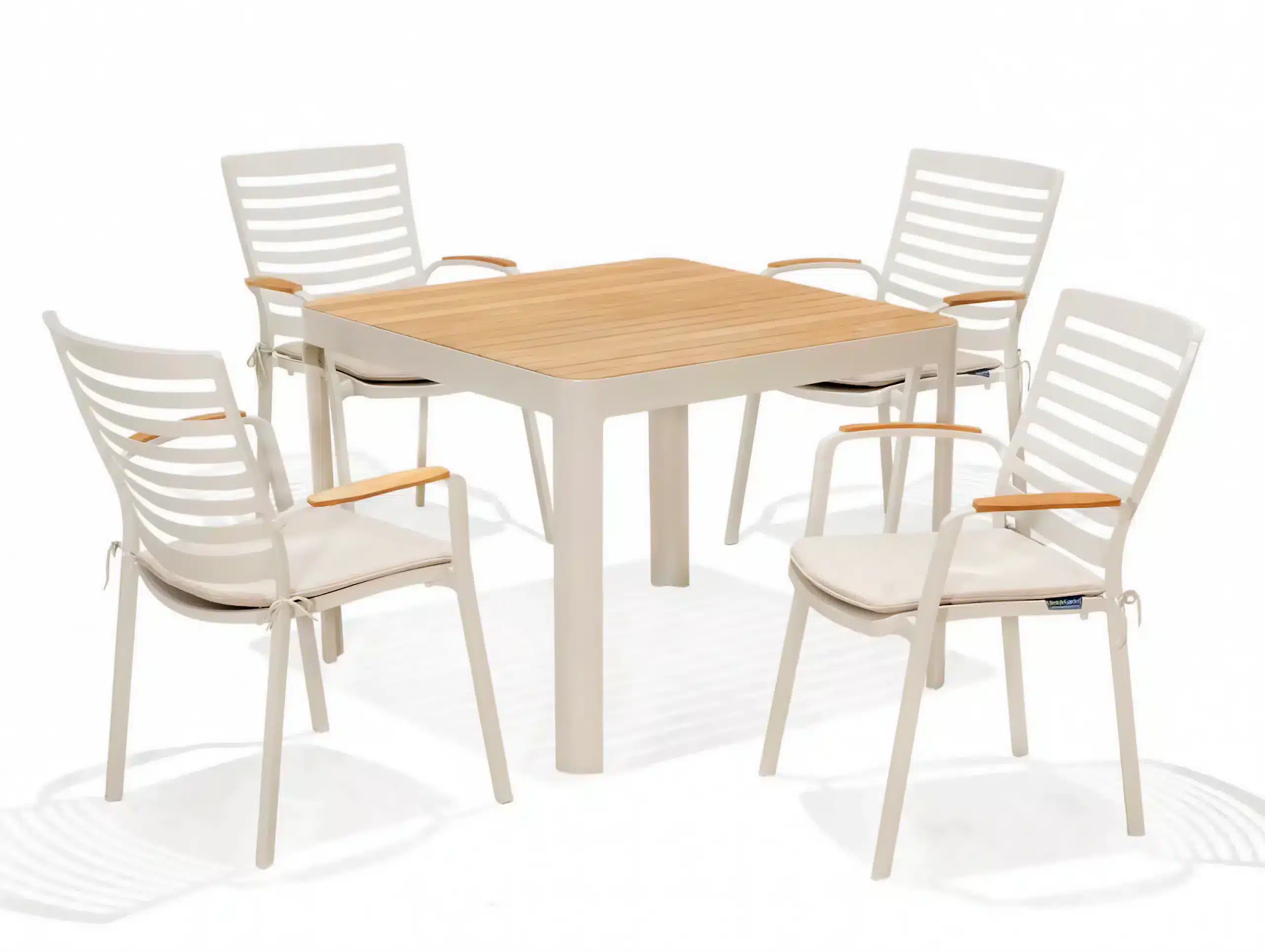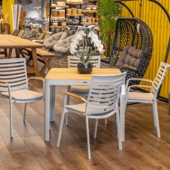 כיסא מעוצב ויוקרתי אשר בנוי משלדת אלומיניום “אל חלד” בשילוב משענות ידיים מעץ טיק אינדונזי.