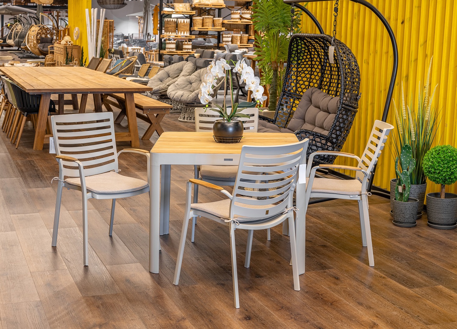 שולחן אלומיניום “אלד חלד” בשילוב לוחות עץ טיק אינדונזי.