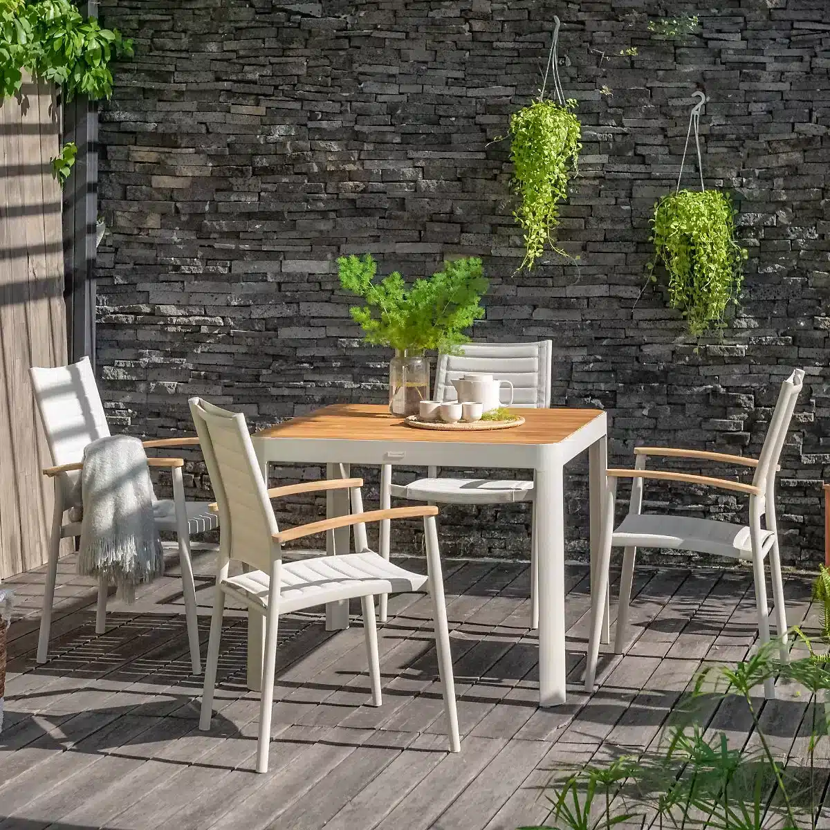 כיסא מעוצב ויוקרתי אשר בנוי משלדת אלומיניום “אל חלד” בשילוב משענות ידיים מעץ טיק אינדונזי.