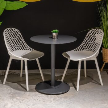 שולחן ביסטרו מעוצב הבנוי מאלומיניום “אל חלד” בשילוב זוג כיסאות קוסמוס.