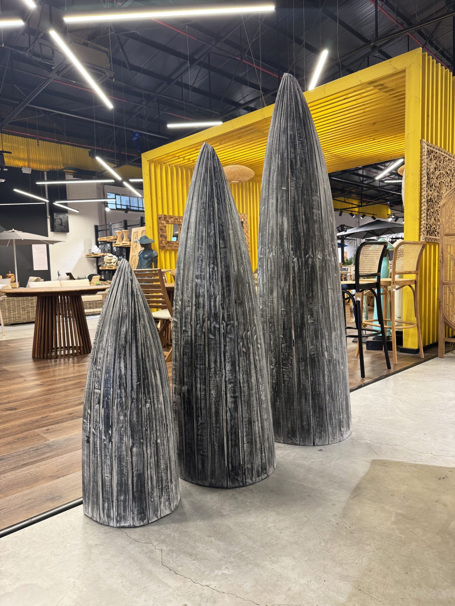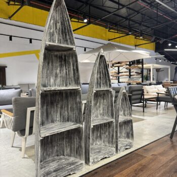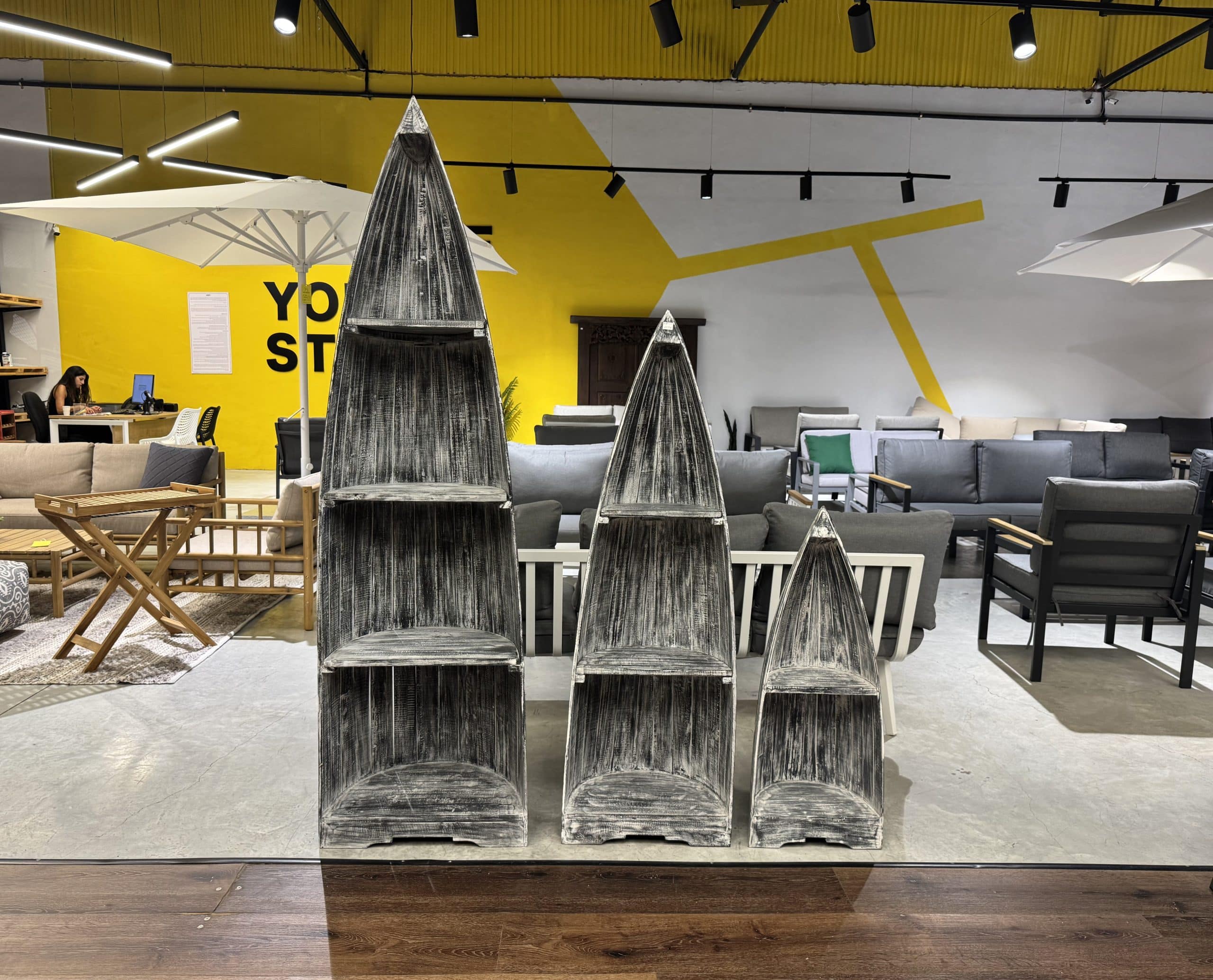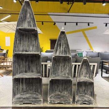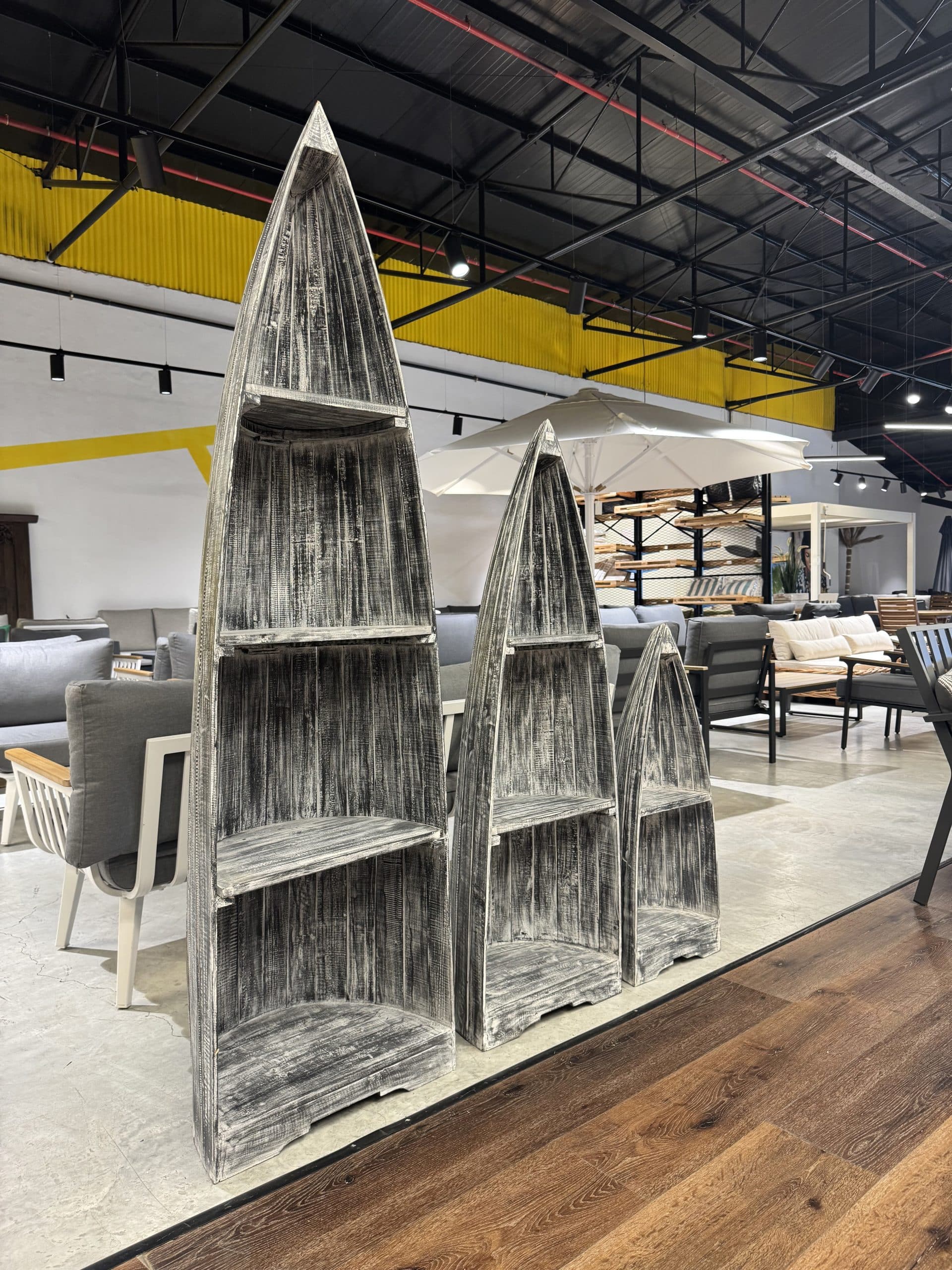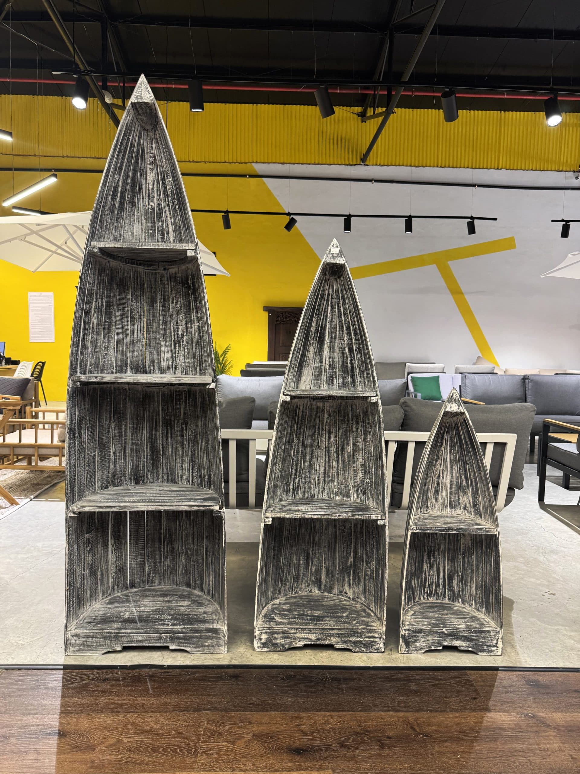 סט 3 סירות קאנו מעץ טיק בגדלים שונים.